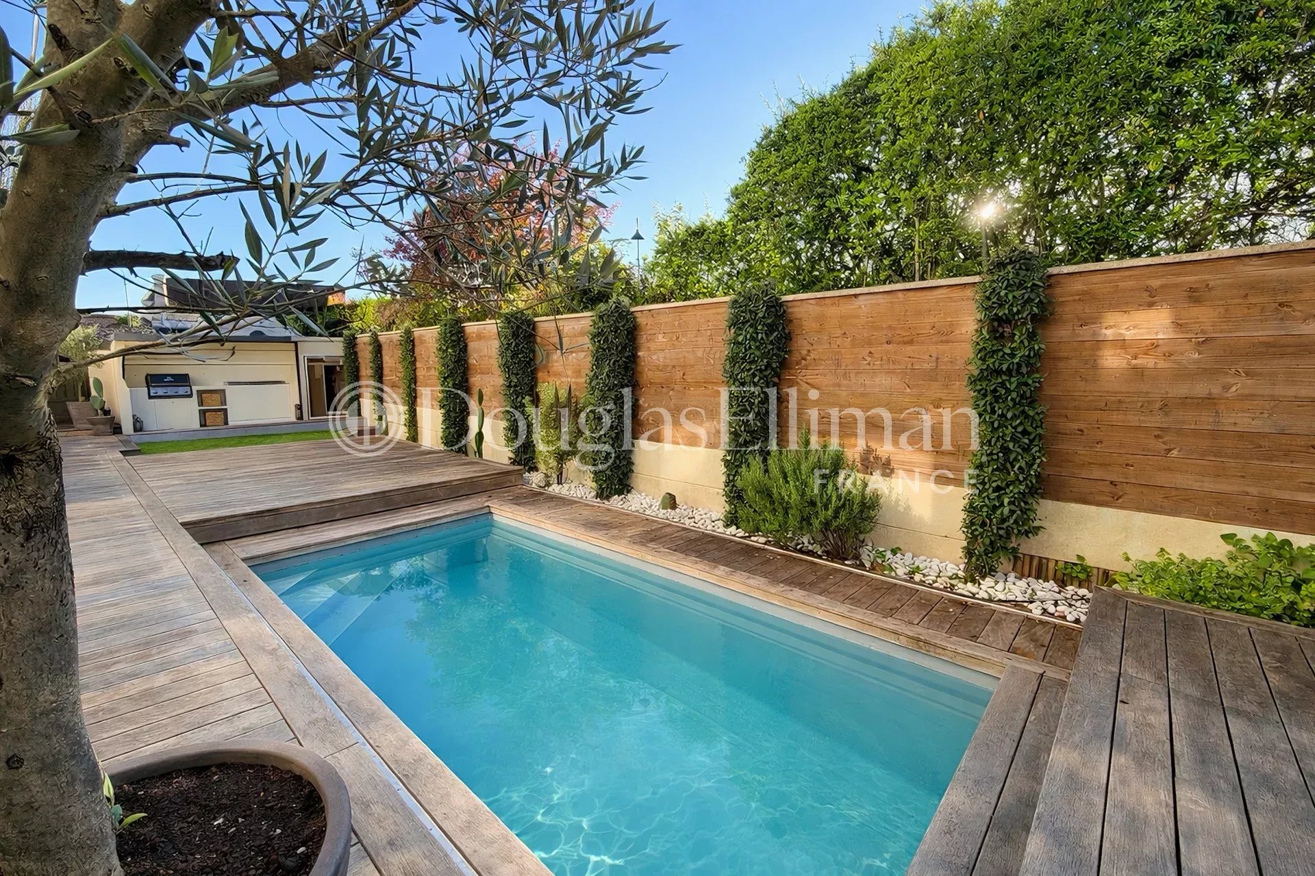 The carefully landscaped garden features a wooden terrace and swimming pool. A closed garage and several parking spaces complete the ensemble.