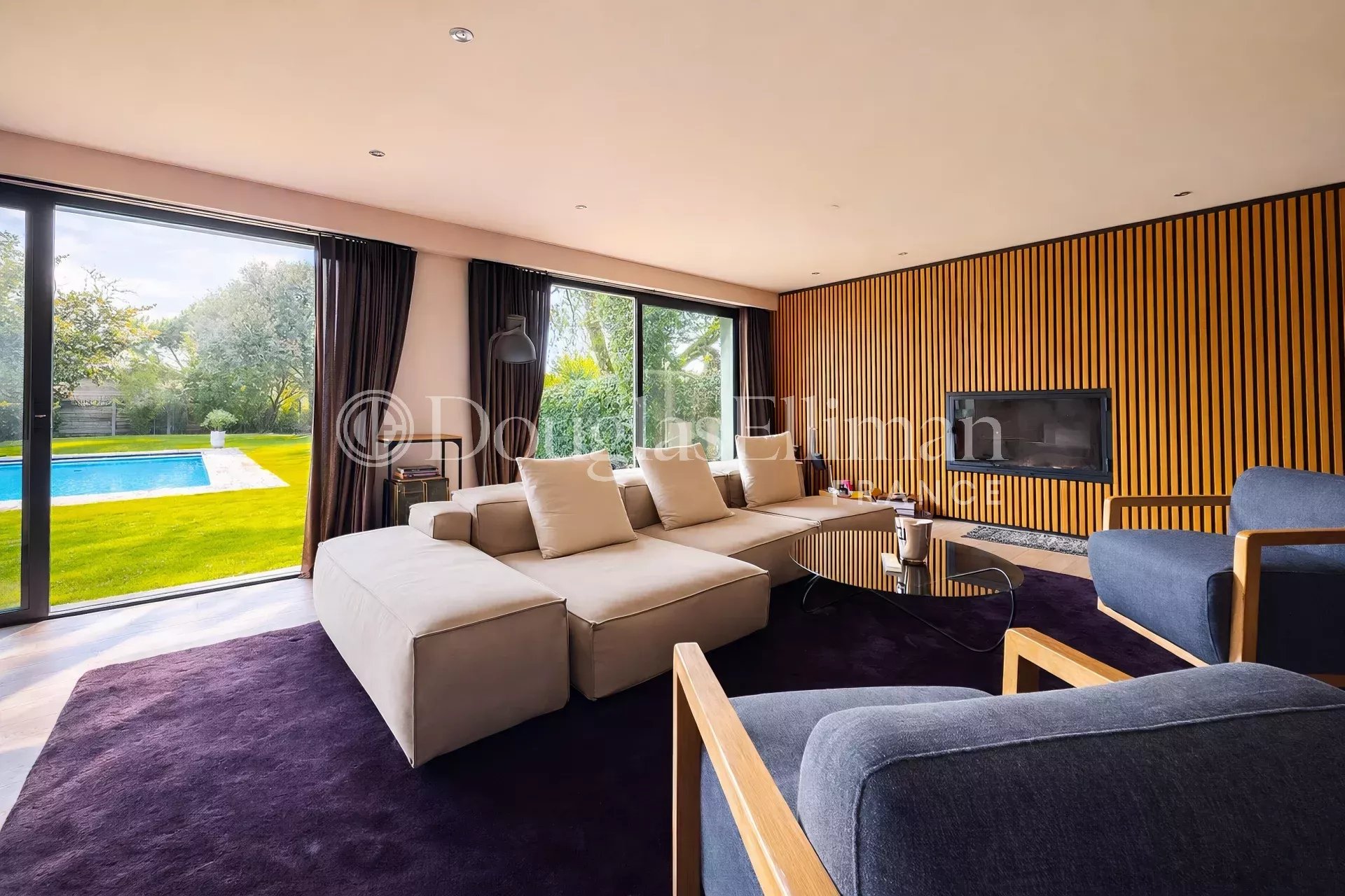 From the moment you enter, you’ll appreciate the generous volumes and luminosity of the vast 90 m2 living room, sublimated by its parquet flooring, fireplace and large picture windows opening onto a beautiful terrace with heated swimming pool, magnified by a lovely wooded garden of around 1374 m2.