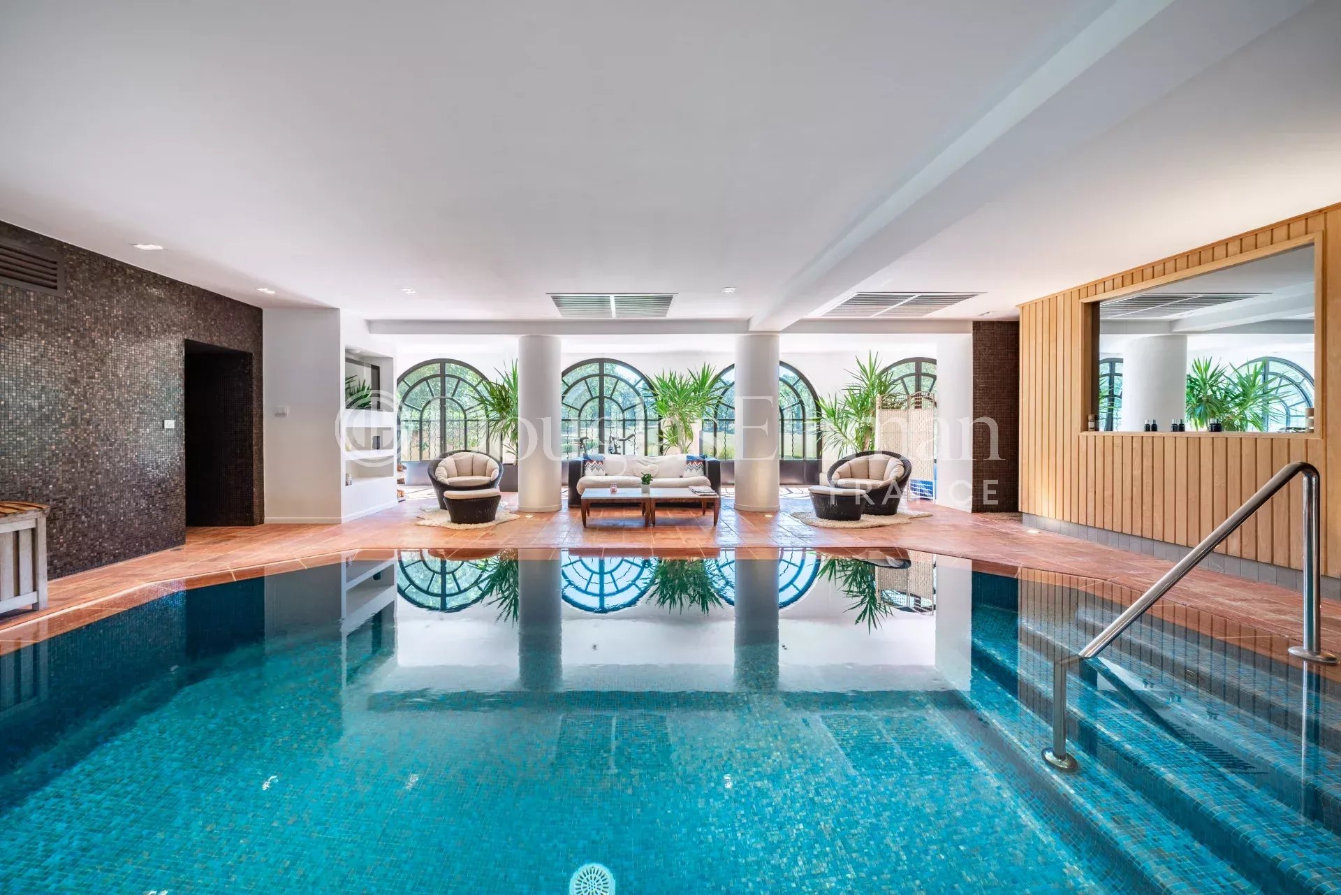 Vertical movement between the 4 floors is seamless (lift), starting from the entrance level where you can descend to the full spa area. Here, you’ll find an indoor swimming pool, an authentic Finnish sauna, a gym, showers, and changing rooms. This level also houses the laundry and staff quarters with a separate entrance.