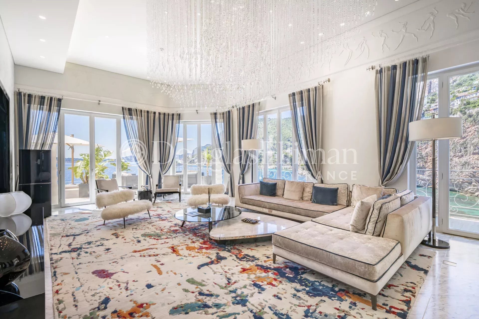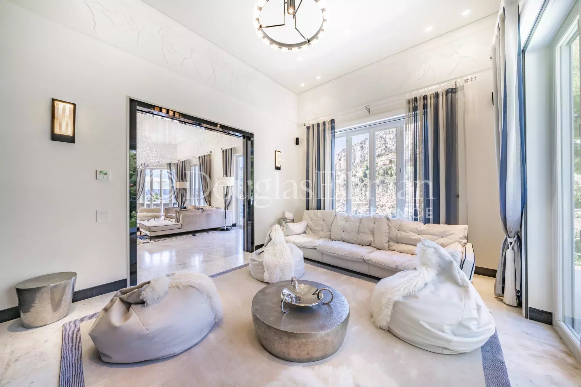 The interiors are extremely bright, with large double French doors offering panoramic sea views, the decor is elegant, with cream marble floors and neutral coloured suede designer furniture.