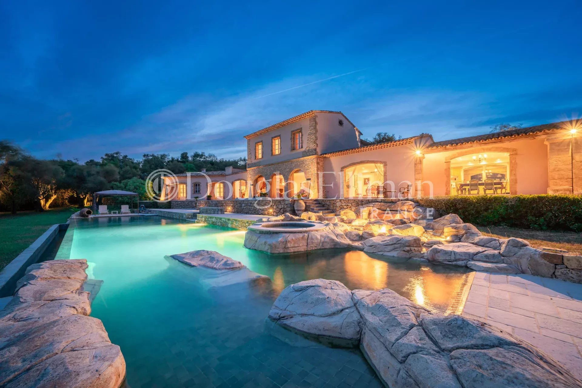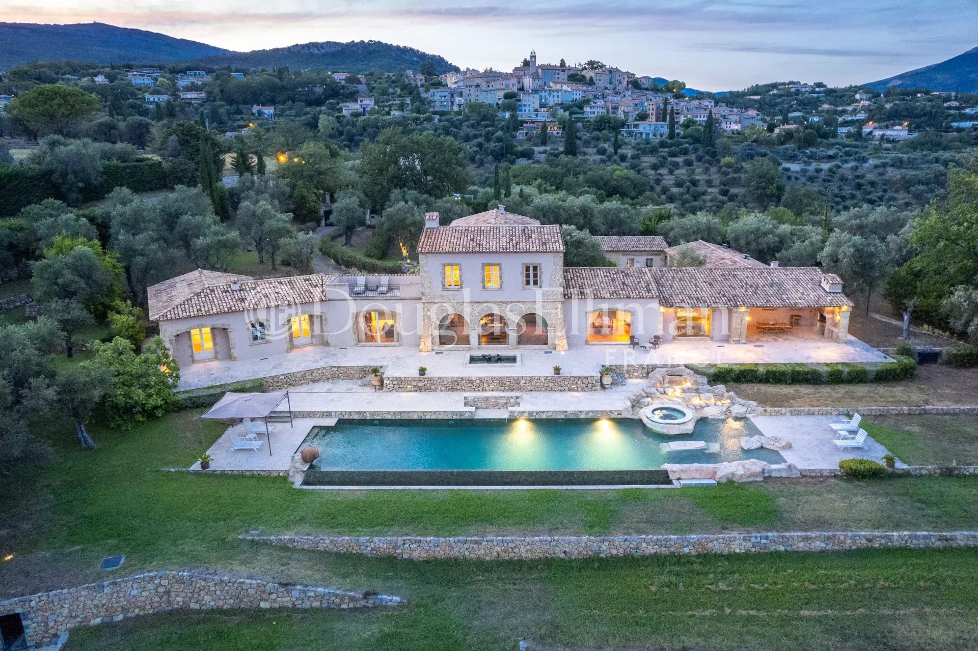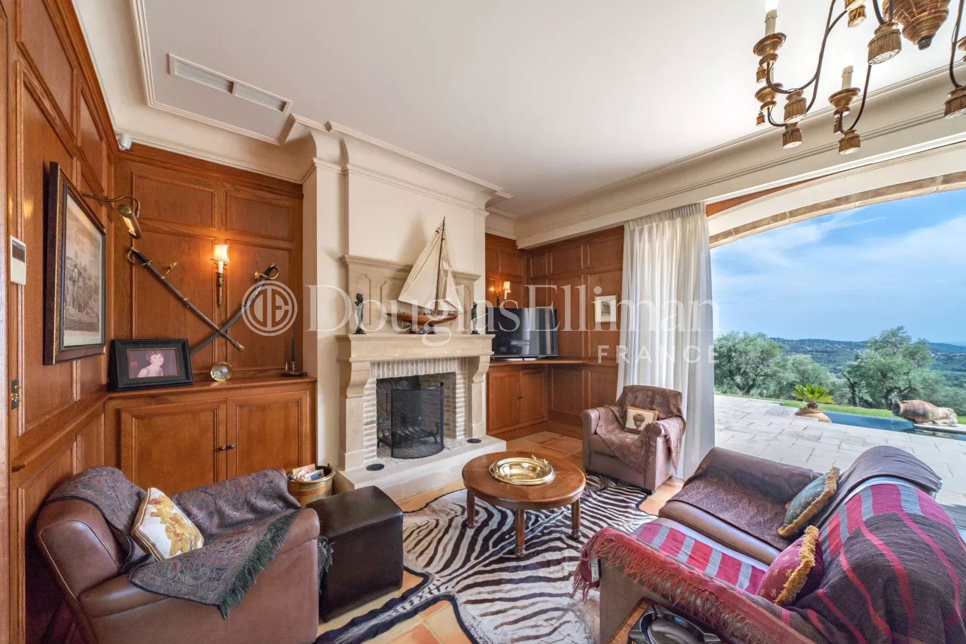 This beautiful property offers a unique setting and exceptional quality. Located on a olive grove just below the Medieval village of Chateauneuf de Grasse, 20 minutes from Cannes and the beaches, it enjoys a truly spectacular panoramic sea and countryside view as well as a beautiful view of the village. The property consist of a spacious entrance hall with cloakroom, a large living room with a stone fireplace, dining room and fully equipped kitchen with breakfast area and access to covered terrace with BBQ. Library/study with fireplace, 3 guest suites all with bathrooms and fitted wardrobes.