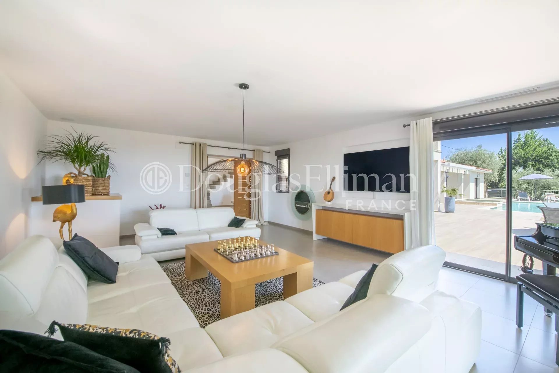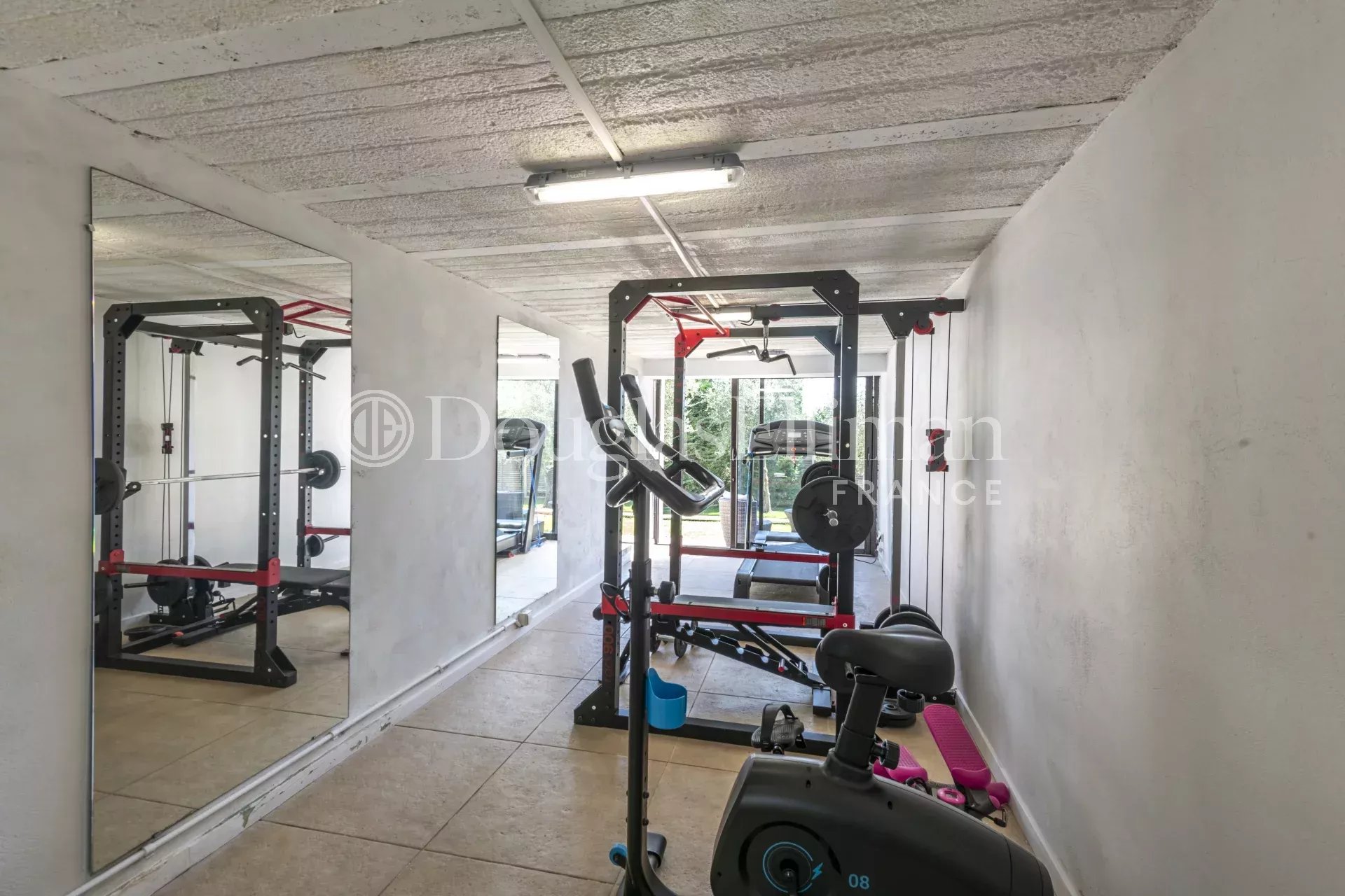 The villa includes a swimming pool, a small gym and separate studios. It is double-gated and offers parking for several cars. There is also a wine cellar, a laundry room and an office.
