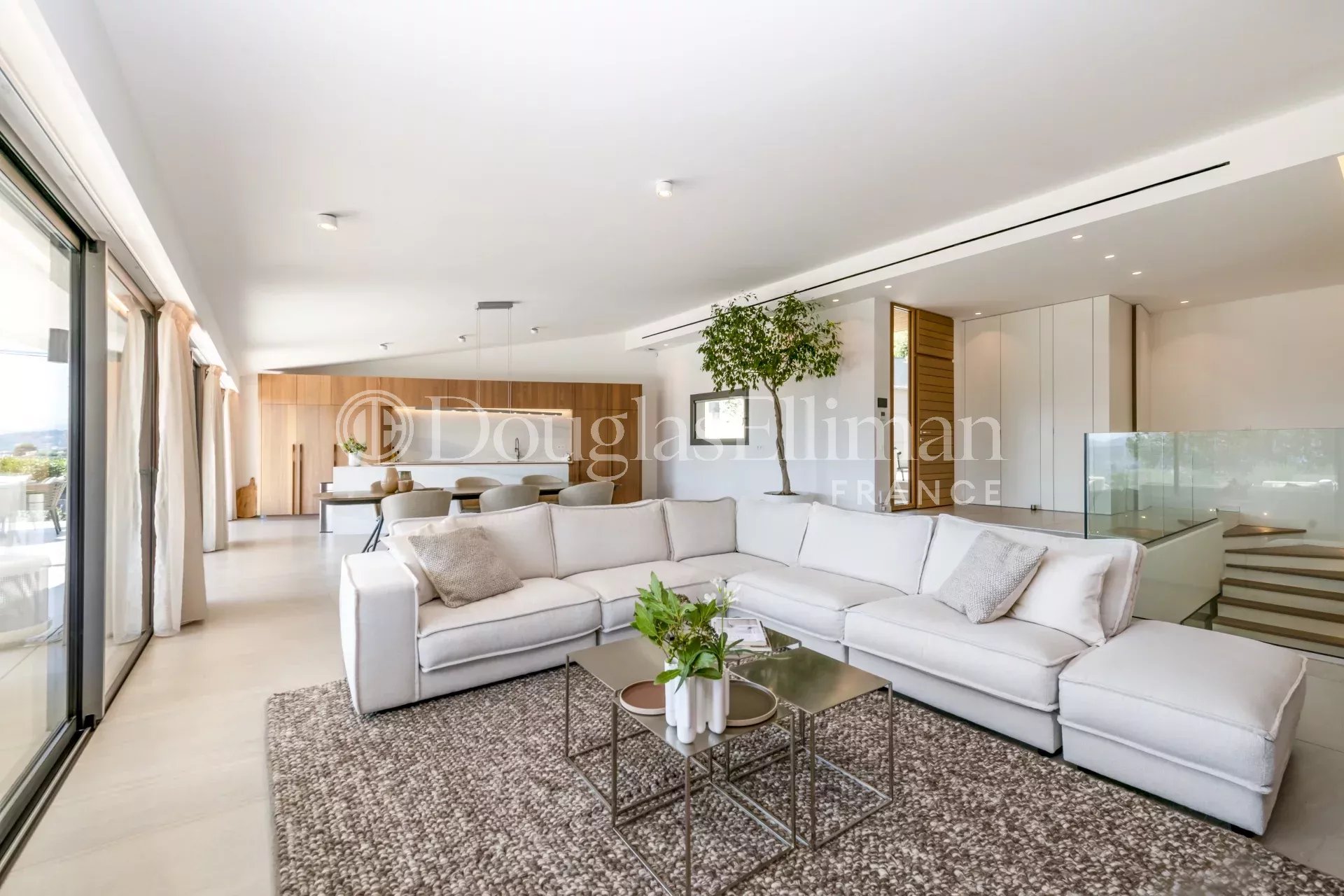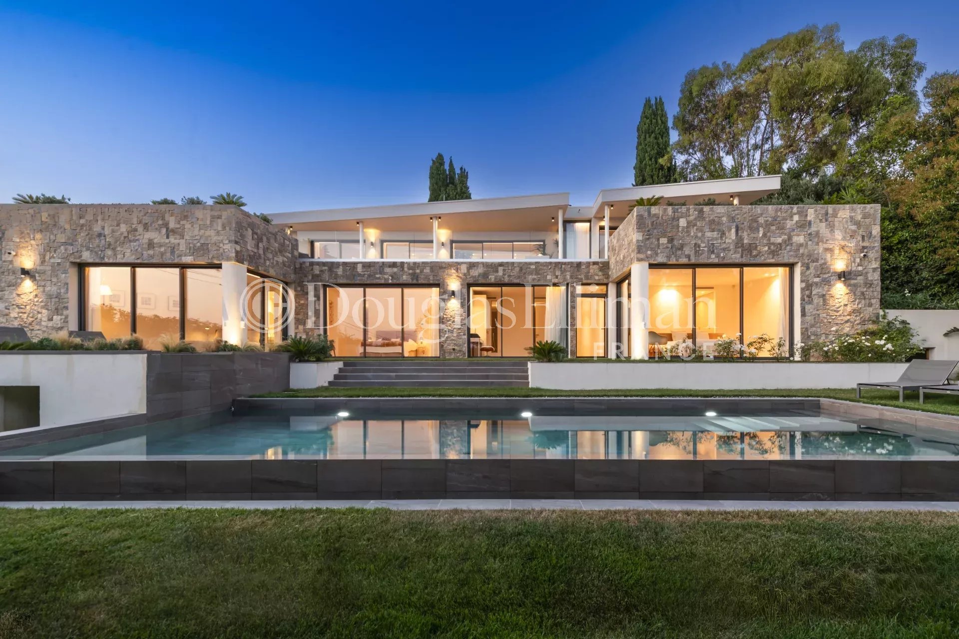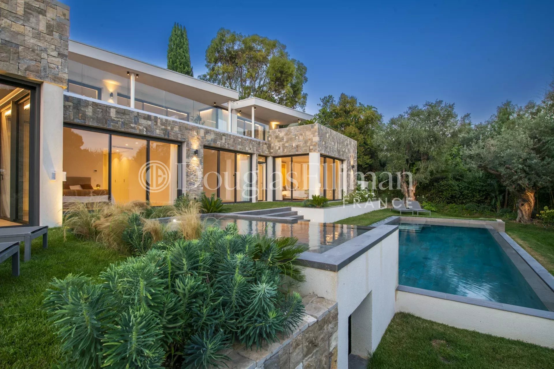 In absolute peace and quiet, nestling in the heart of a wooded garden of almost 1,300sqm with a saltwater swimming pool, this magnificent, fully-secured villa of around 400sqm, designed by a renowned architect, enjoys a magnificent panoramic view of the Estérel massif and a lovely glimpse of the sea.