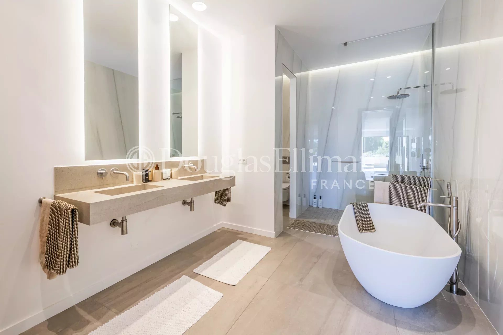 Bathed in light thanks to large bay windows opening onto the garden and the terrace of almost 100sqm, it features a vast, generously proportioned reception room with fireplace, a fully equipped open-plan kitchen, a TV room, an ensuite master bedroom with dressing room and 4 other en suite bedrooms.