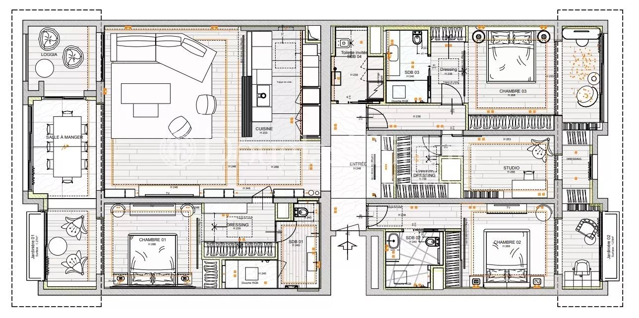 With a surface area of 245 m2, it features a spacious living room with open kitchen and dining area, four very large bedrooms, each with its own built-in closet and marble bathroom, a superb enclosed terrace and a laundry room.