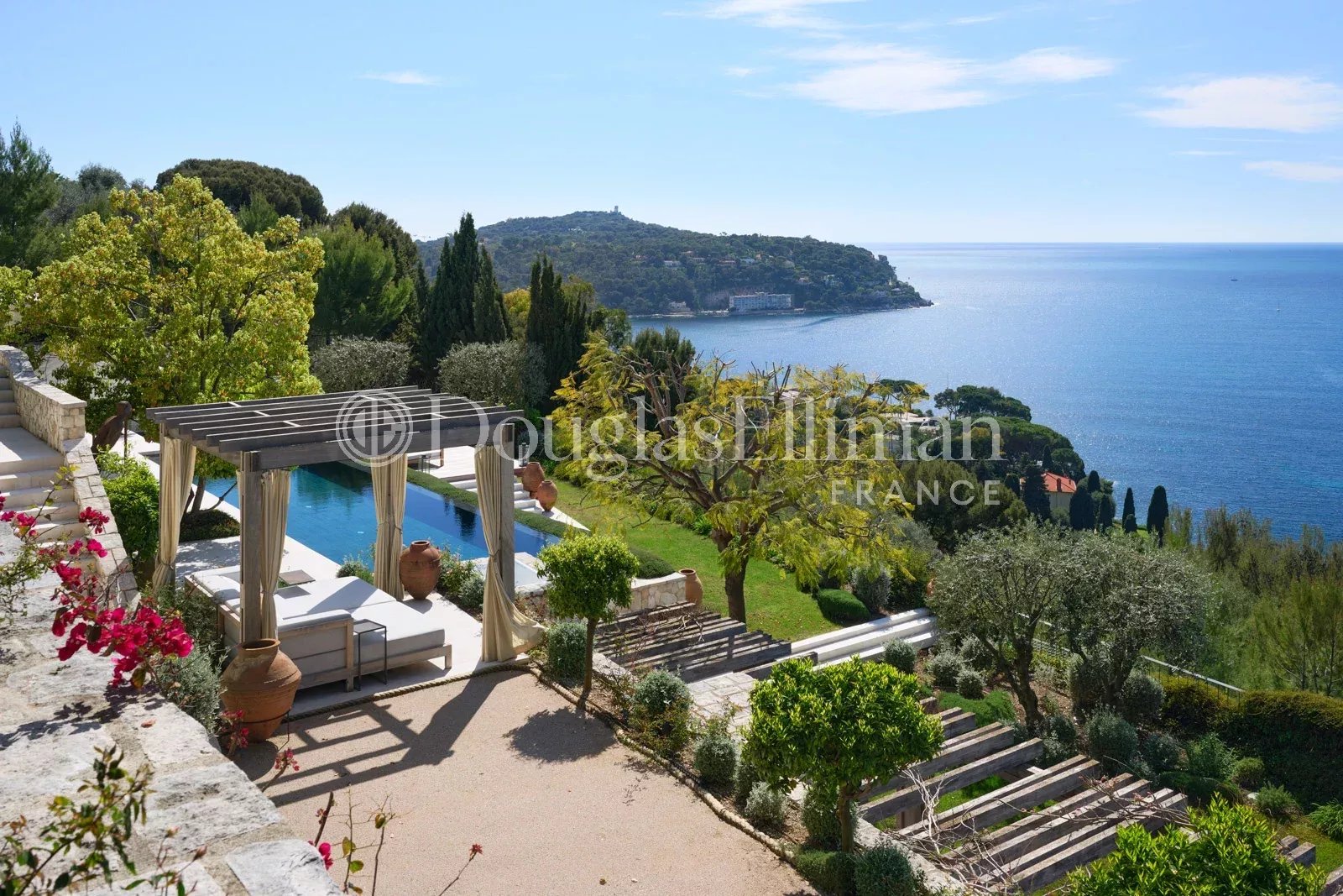 Bathed in sunlight from morning to evening thanks to its elevated position, the property enjoys stunning views of the sunrise over Saint-Jean-Cap-Ferrat and the sunset over the bay.