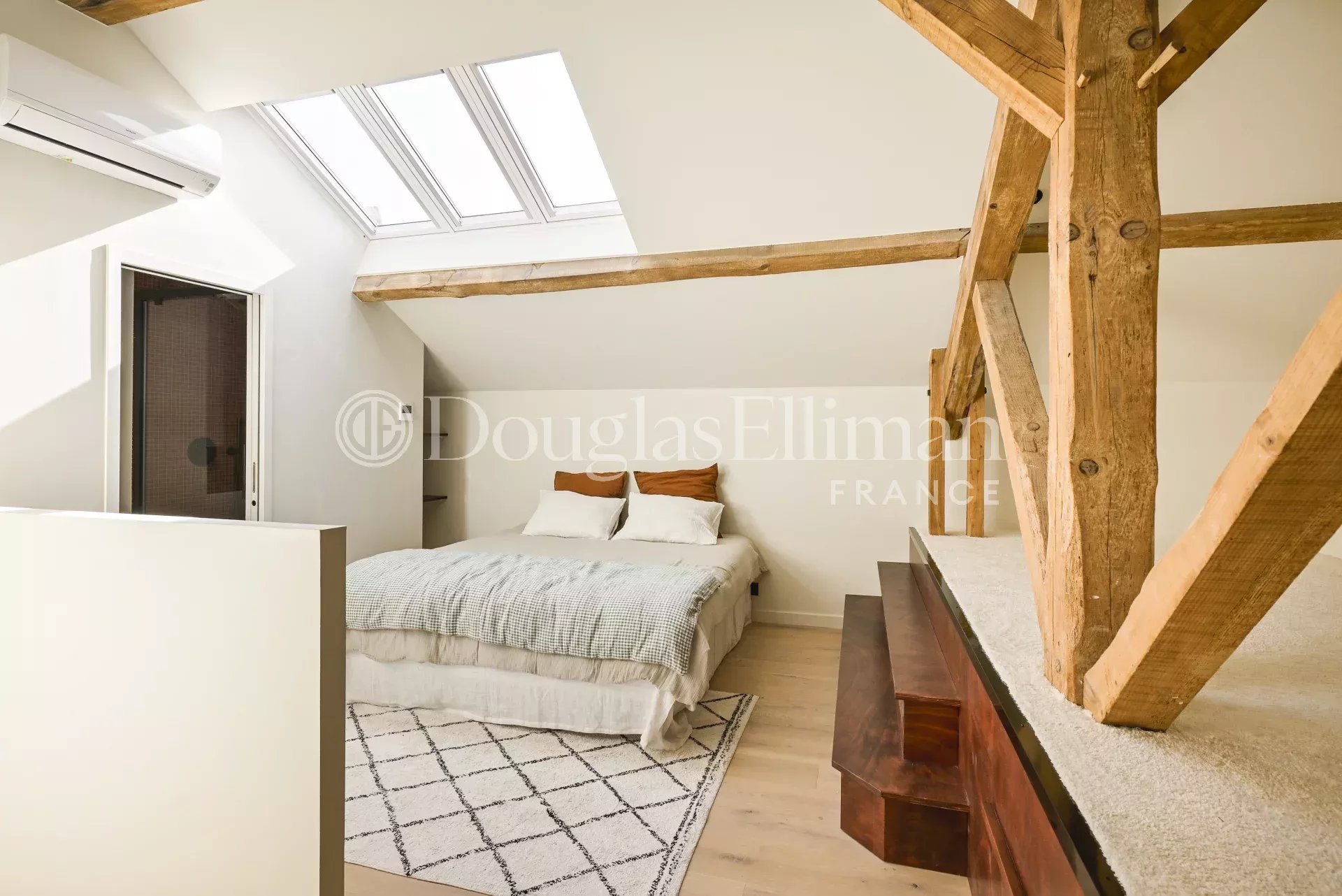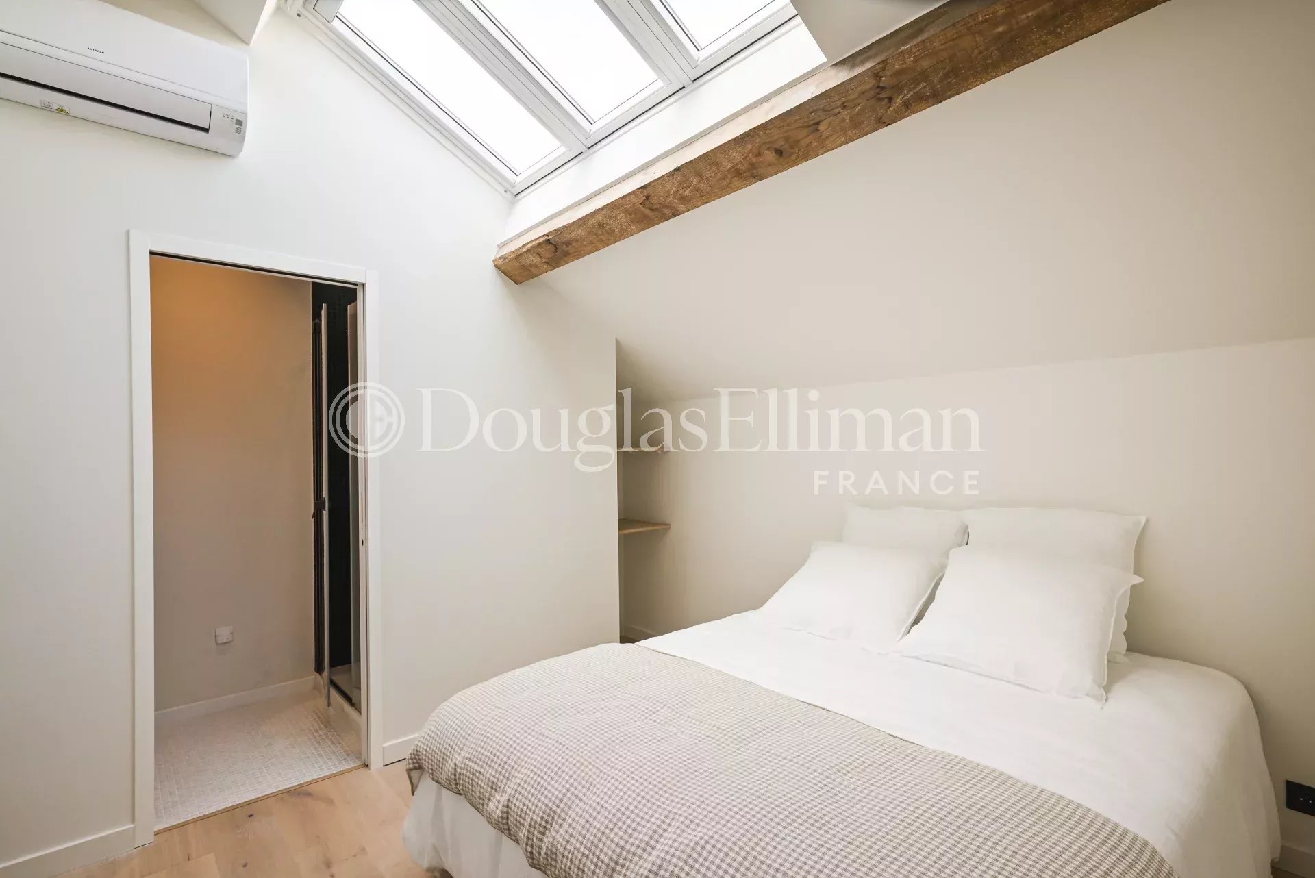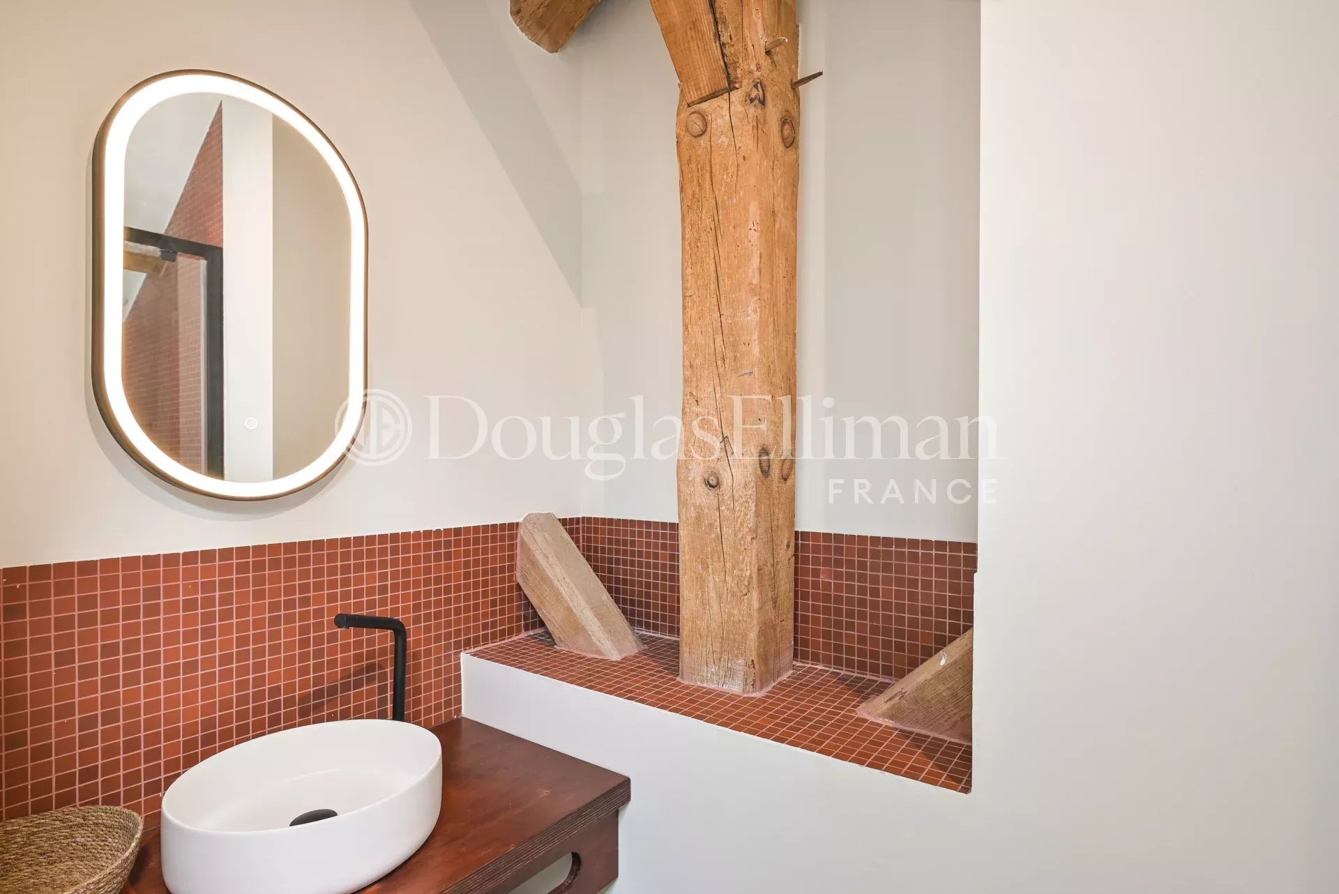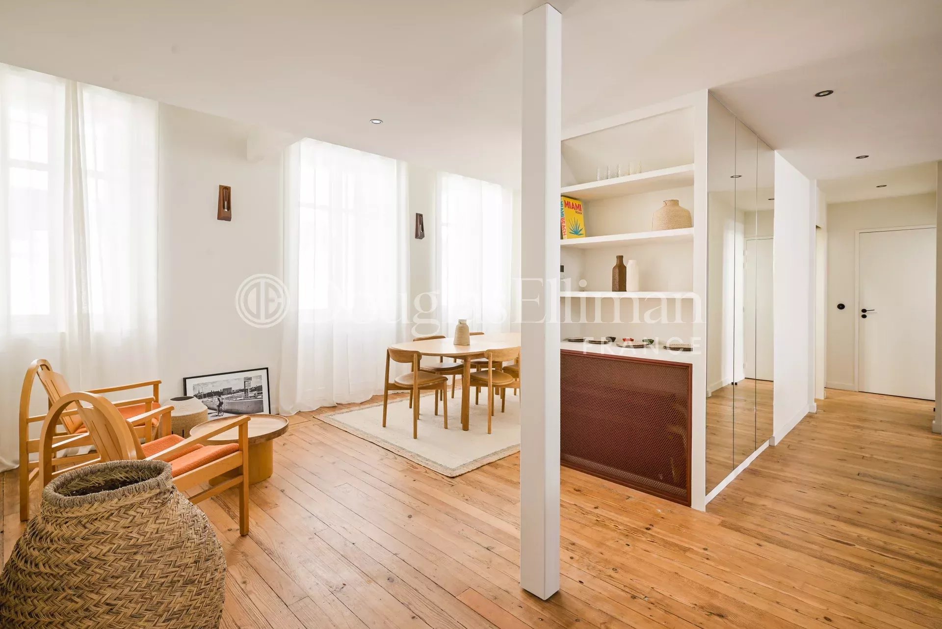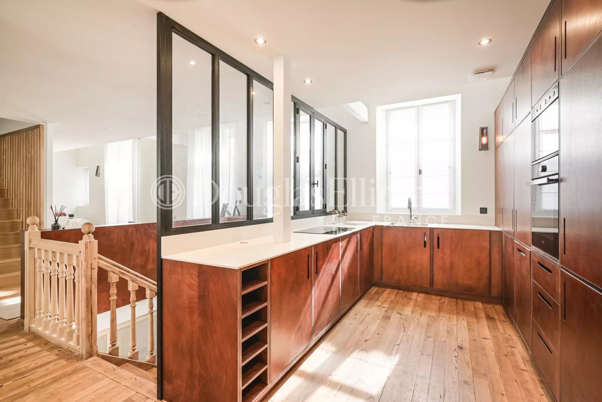 La rénovation complète a privilégié la qualité des matériaux et la mise en valeur des volumes existants repensés : belles hauteurs sous plafond, conservation et restauration des boiseries, apport de lumière naturelle optimisé. L’ensemble est climatisé.