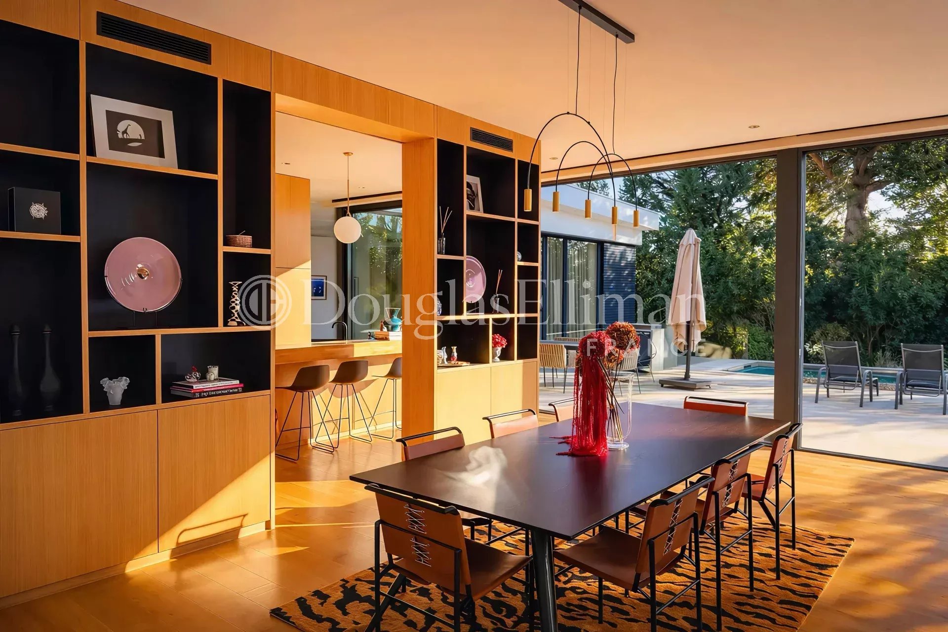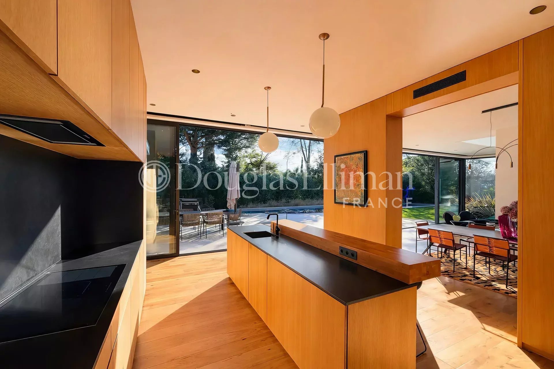 Cette villa de luxe se trouve être très lumineuse, sa conception de type californienne amène la mise en œuvre de pièces ouvertes au maximum sur l’extérieur. Elle casse les codes traditionnels de l’habitat pour revisiter de nouvelles perspectives et investissements de l’espace. La partie centrale de la maison est orientée sur l’extérieur et permet, dès les beaux jours, de vivre dans un espace totalement ouvert, donnant vue directe sur la terrasse exposée Sud, et la majestueuse piscine de 23 mètres. Elle accueille sur 137m2 l’espace de vie/séjour ainsi que la cuisine ouverte, habilement isolée de l’espace principal tout en permettant une circulation aisée.