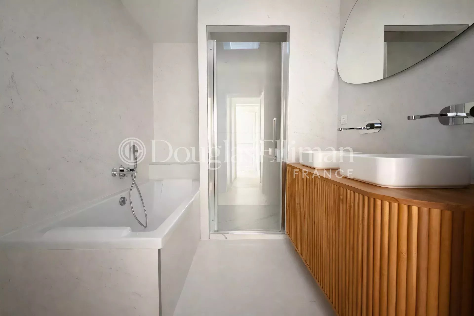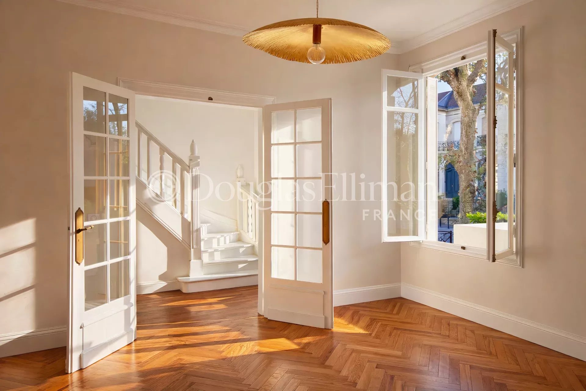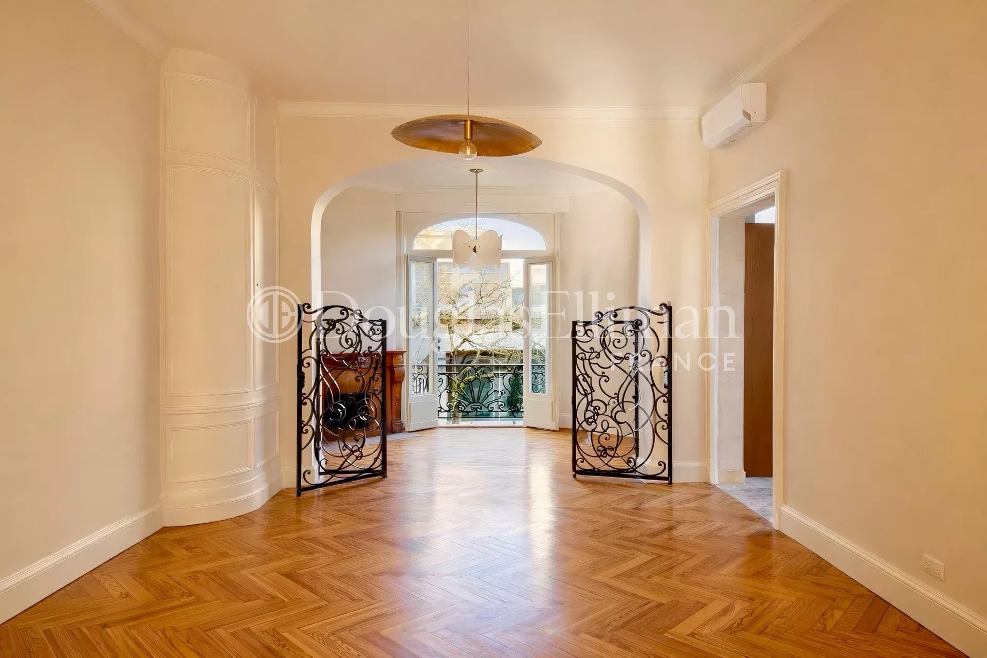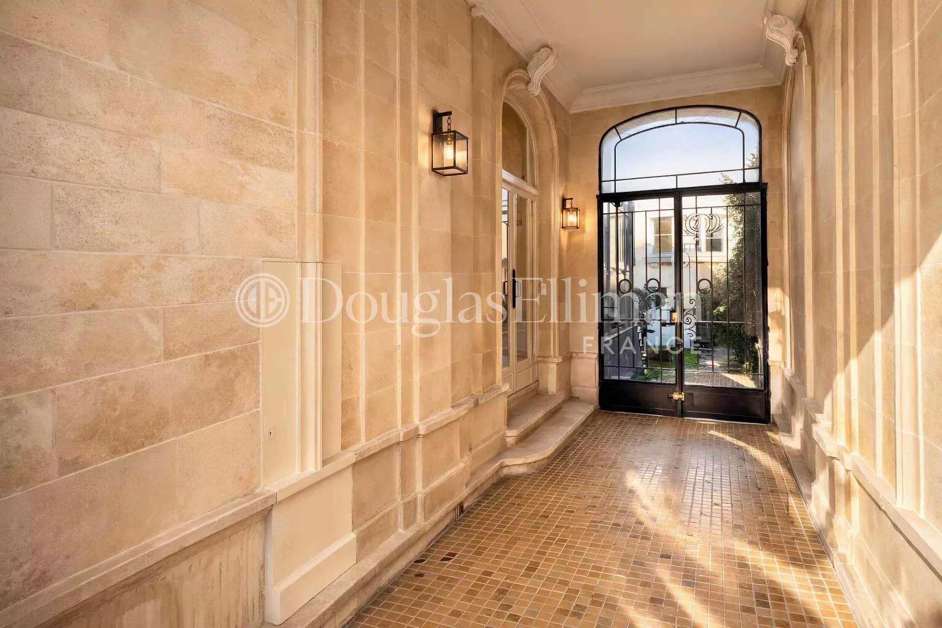 Passé le jardin d’accueil, permettant le stationnement de deux véhicules, l’entrée se fait par une galerie couverte, typique des Hôtels Particuliers, qui mène à un intérieur lumineux aux volumes généreux.