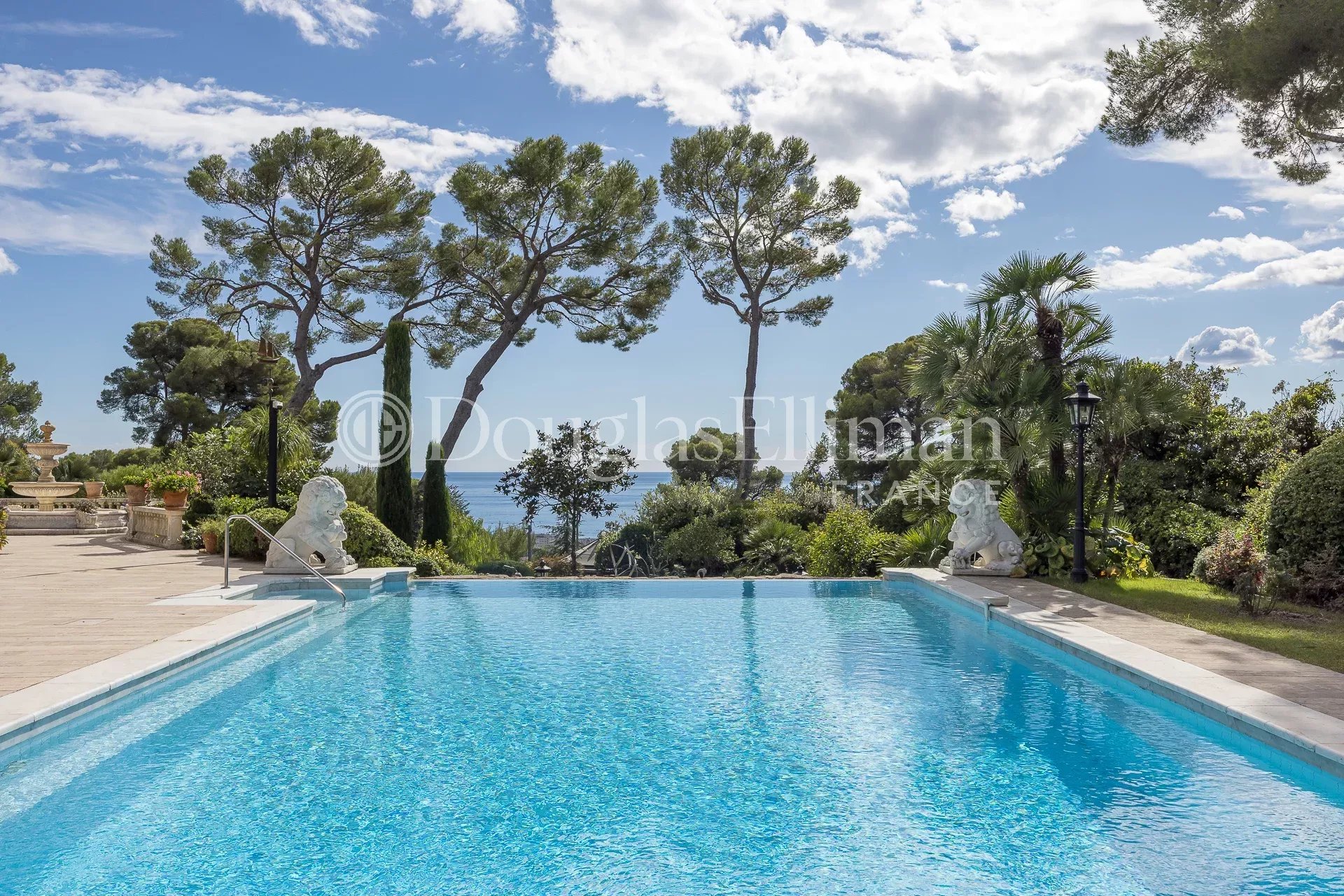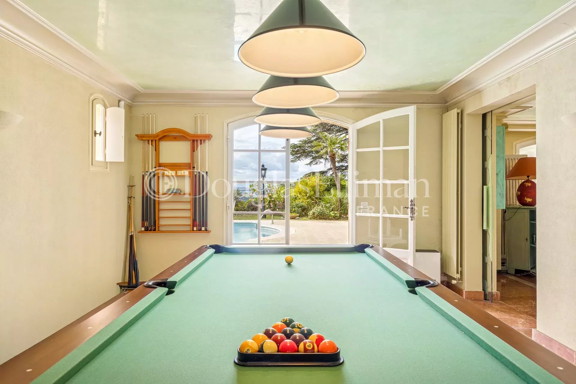 À l’extérieur, l’espace piscine s’ouvre sur de splendides vues mer et verdure. La longue piscine à débordement est accompagnée d’un vaste pool house comprenant une salle de jeux avec billard, un salon-bar et un espace spa complet – l’endroit idéal pour se détendre et recevoir.
