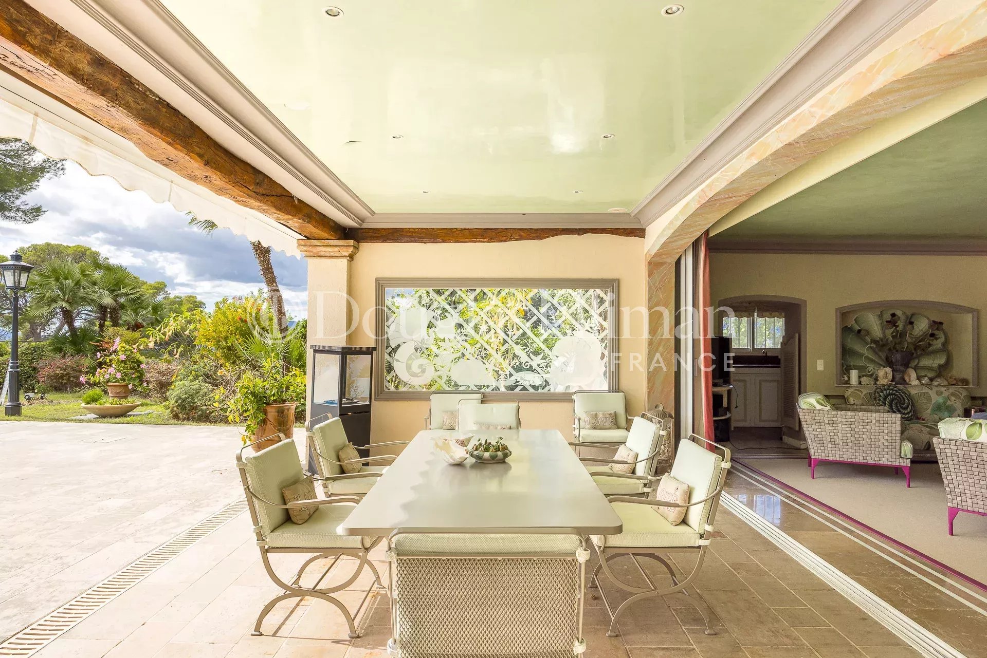 La villa principale incarne toute l’élégance de la Riviera : deux superbes suites de maître, un appartement de personnel intégré, un hall d’entrée imposant, de vastes espaces de réception avec salon et salle à manger, ainsi qu’une grande cuisine équipée pour un usage familial ou professionnel, agrémentée d’un bar et d’un espace de divertissement.