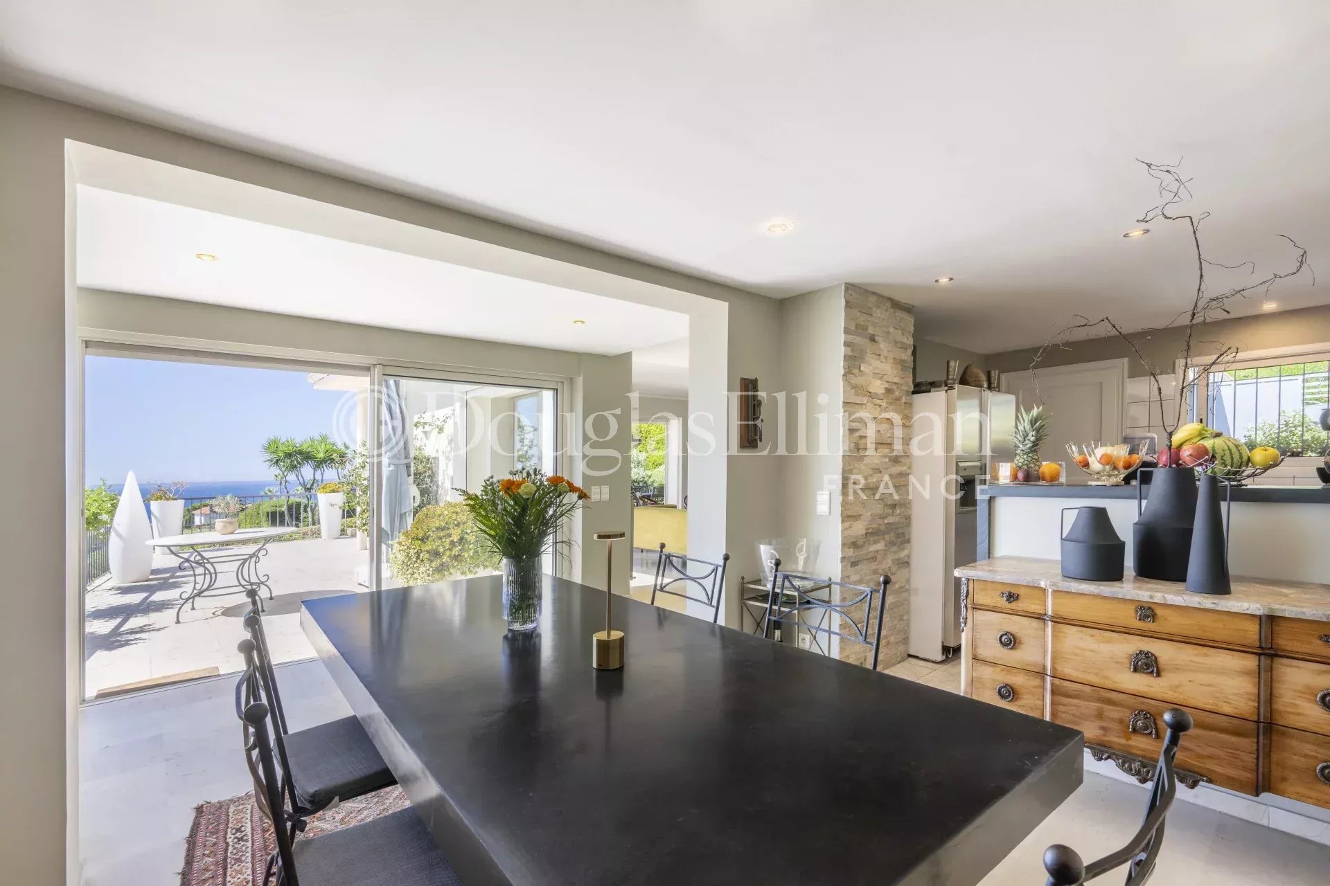 Édifiée sur un terrain paysager, la propriété se développe principalement de plain-pied et se distingue par ses volumes généreux et sa distribution fluide. L’entrée mène à un vaste espace de réception comprenant un salon lumineux ouvert sur une très grande terrasse ensoleillée, idéale pour profiter des repas en plein air face à la mer. Une salle à manger indépendante et une cuisine séparée, entièrement équipée, viennent compléter cet espace de vie convivial et chaleureux.