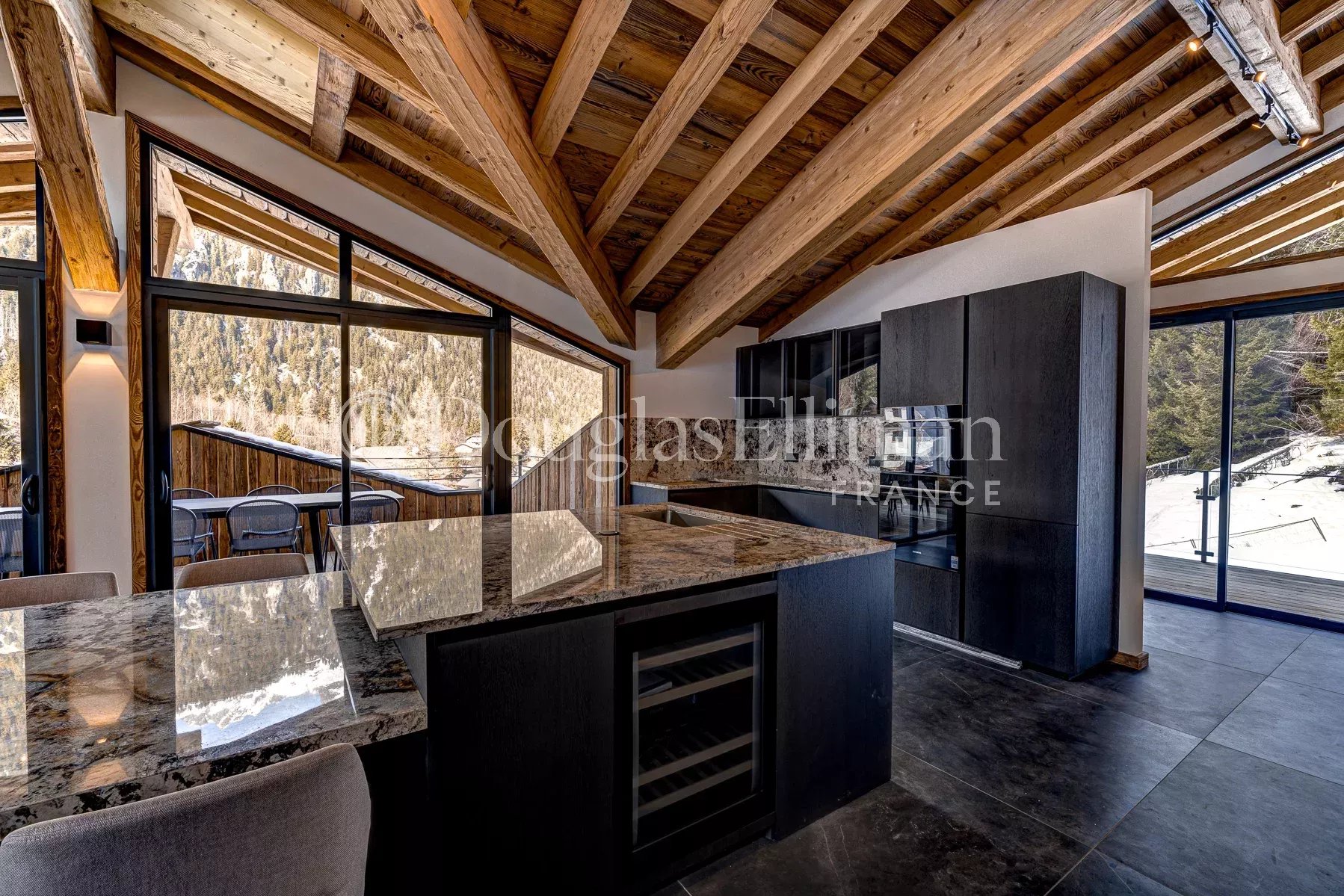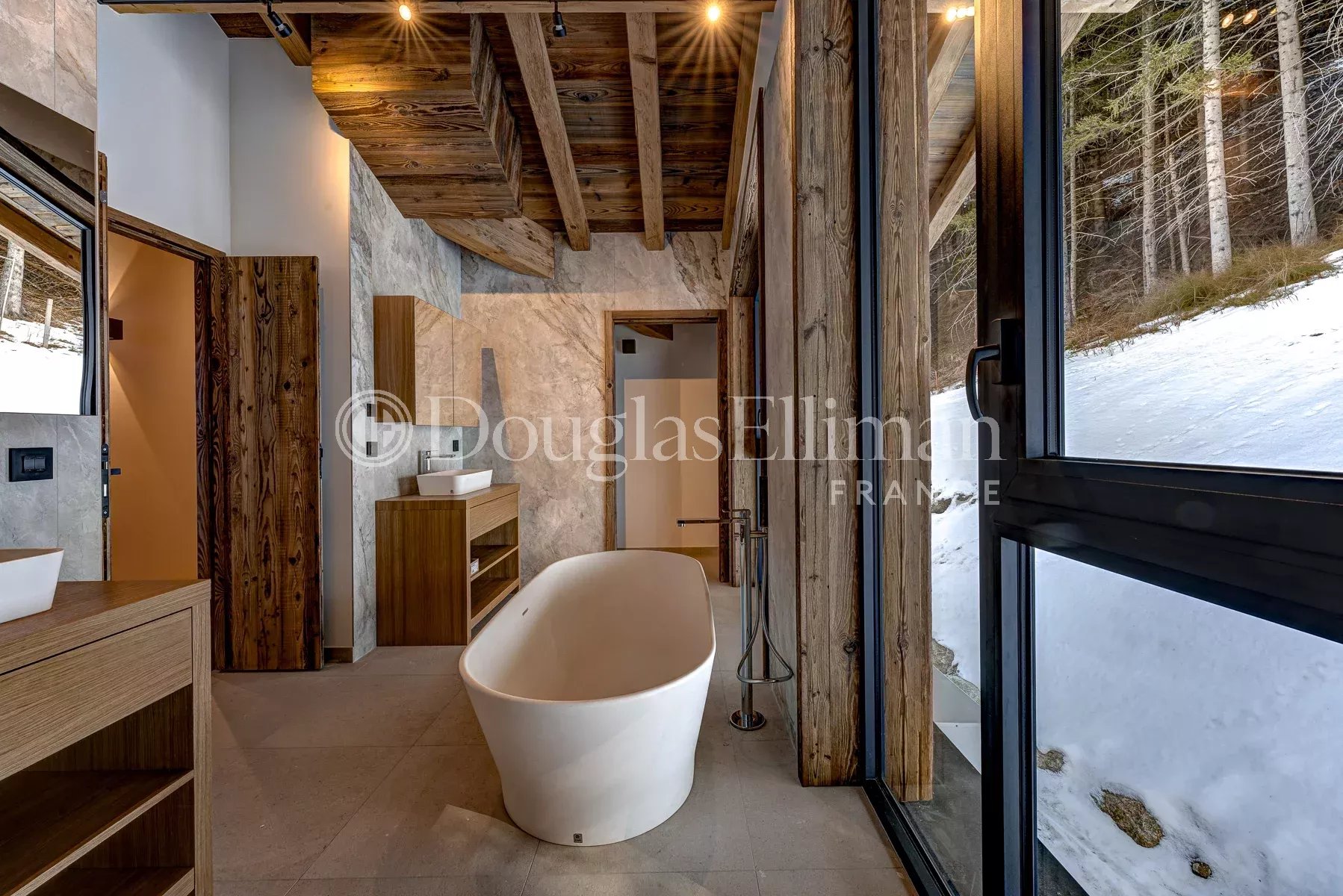 Le double espace de vie principal, situé aux étages supérieurs, dispose de balcons/terrasses sur trois côtés pour profiter au maximum de la vue, ainsi que d’une grande terrasse couverte attenante à la salle à manger. La suite parentale occupe le dernier étage et dispose d’une superbe salle de bains donnant sur la forêt à l’arrière.