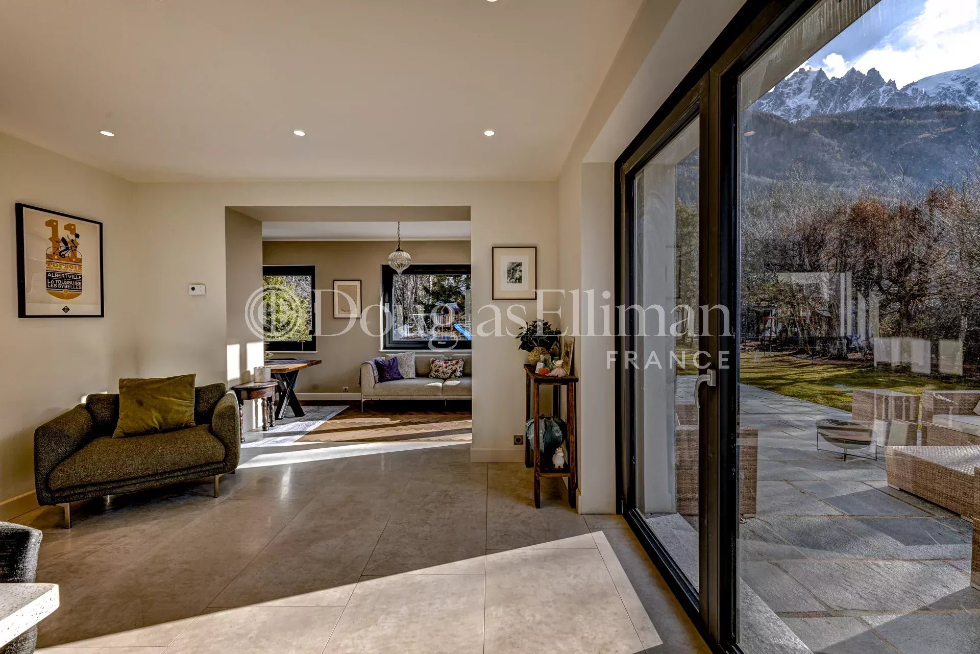 – Grand jardin plat exposé sud-ouest avec des vues fantastiques sur le Mont-Blanc, les Drus et les autres sommets environnants