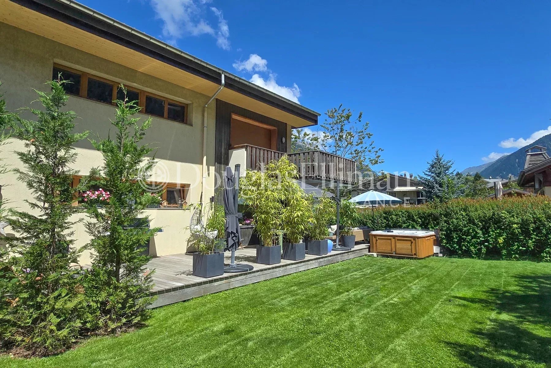 Immense jardin privé avec jacuzzi et vues fantastiques sur le Mont Blanc et les sommets environnants