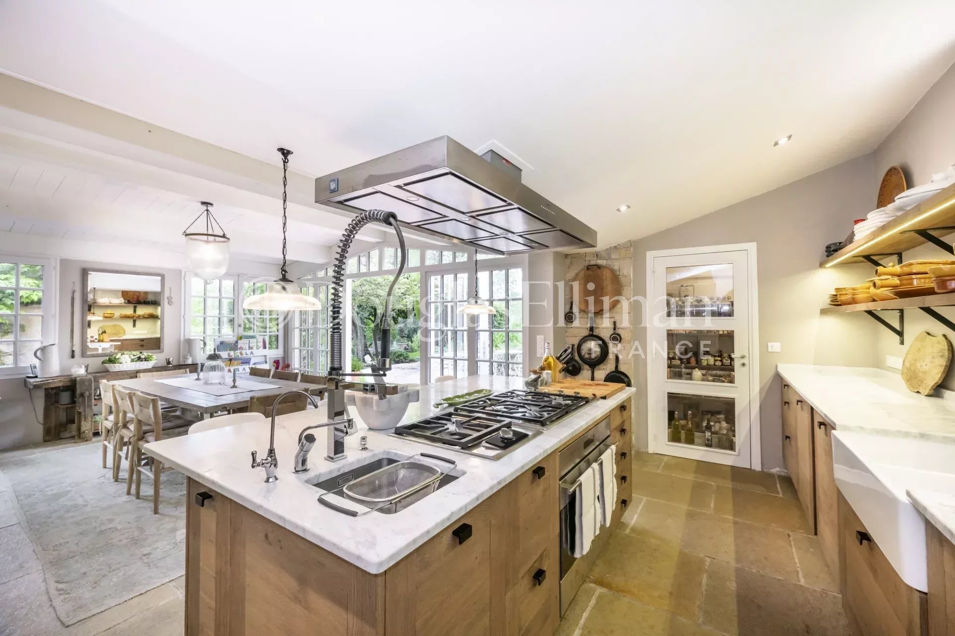La villa principale dispose d’une grande cuisine provençale charmante et bien équipée, avec un immense îlot central et un coin repas avec de grandes baies vitrées donnant sur le jardin et les espaces extérieurs. Le salon et la salle à manger confortables offrent un accès direct à la terrasse et à la piscine.