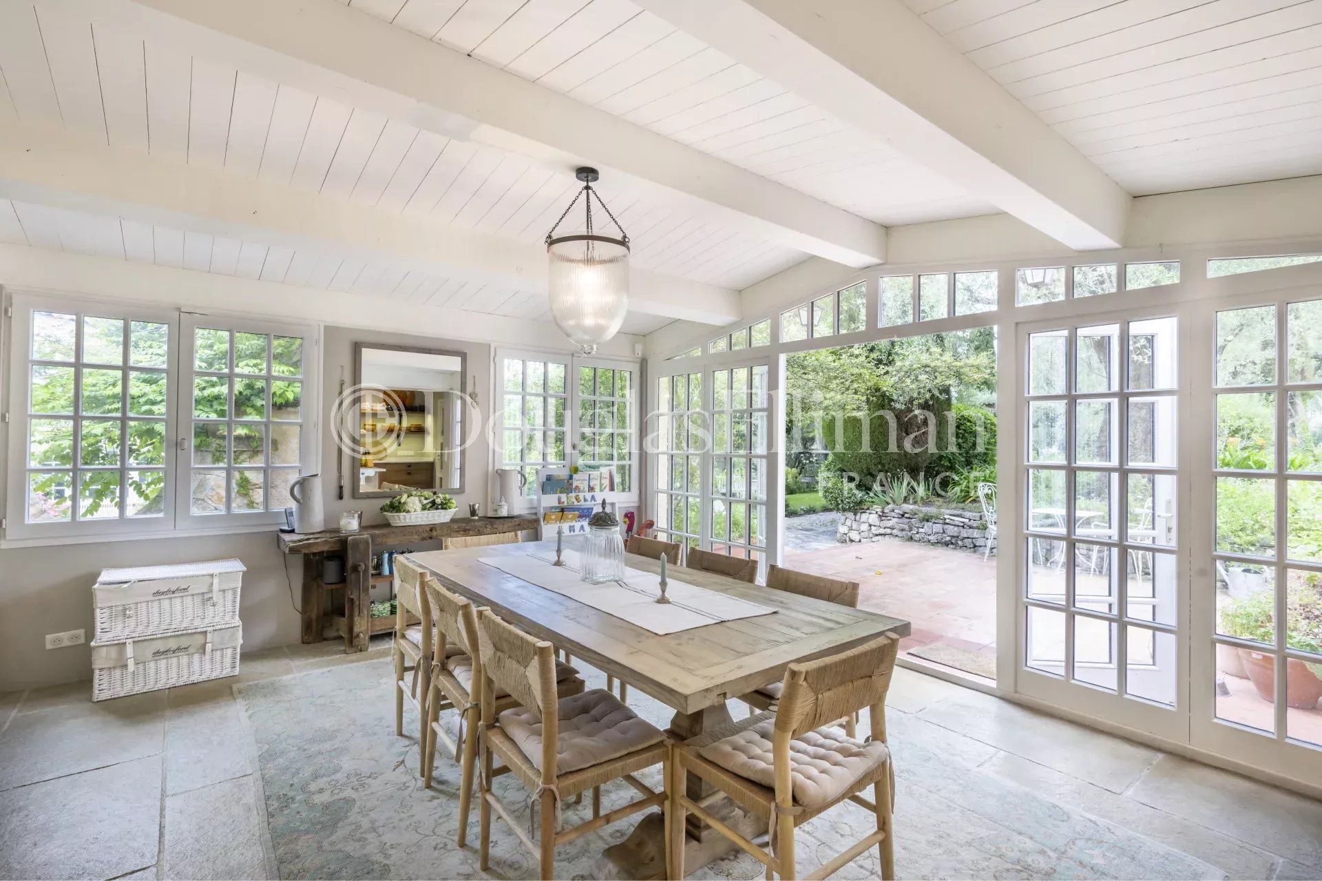 La résidence principale allie le charme provençal au confort moderne et comprend une cuisine spacieuse et entièrement équipée de style rustique avec un îlot central massif et un coin repas, s’ouvrant sur le jardin par de grandes baies vitrées. Le salon et la salle à manger ont un accès direct à la terrasse et à la piscine. Un bureau privé et une bibliothèque se trouvent également au rez-de-chaussée.