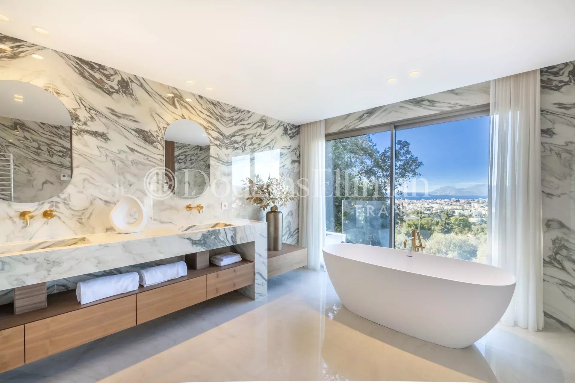 La villa propose quatre chambres confortables, chacune soigneusement aménagée avec leurs salle de bain privative et dressing. Ces espaces accueillants permettent à chaque occupant de profiter d’un cadre intimiste. La suite parentale se situe au premier étage et occupe tout l’espace, pensée comme un véritable cocon. Cet espace offre une grande salle de bain moderne avec une douche design et une vue panoramique, idéale pour des instants de sérénité absolue.