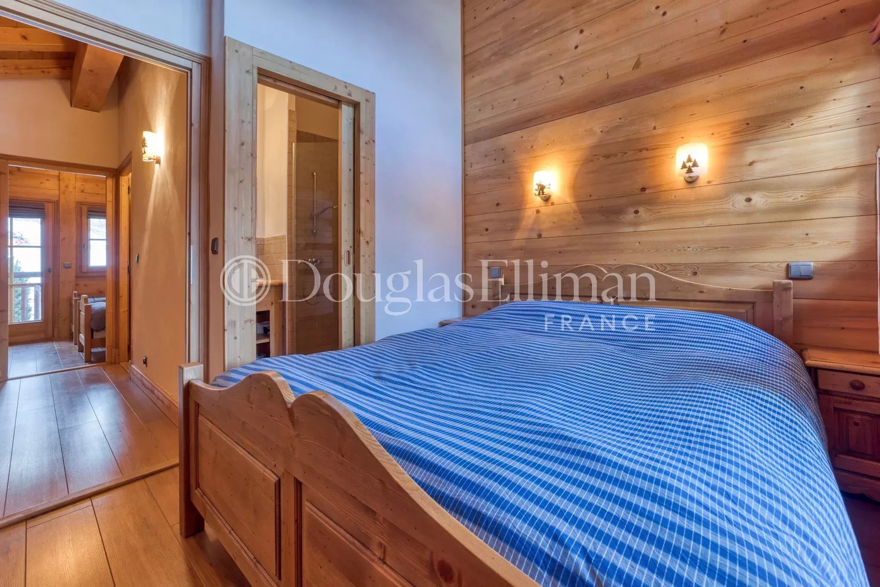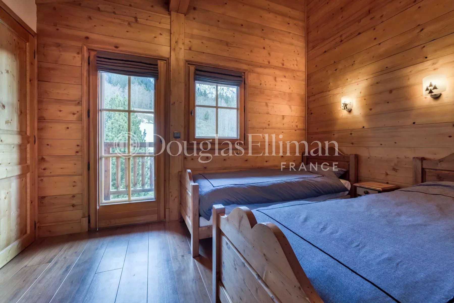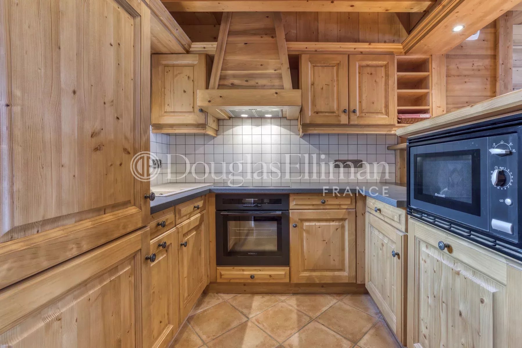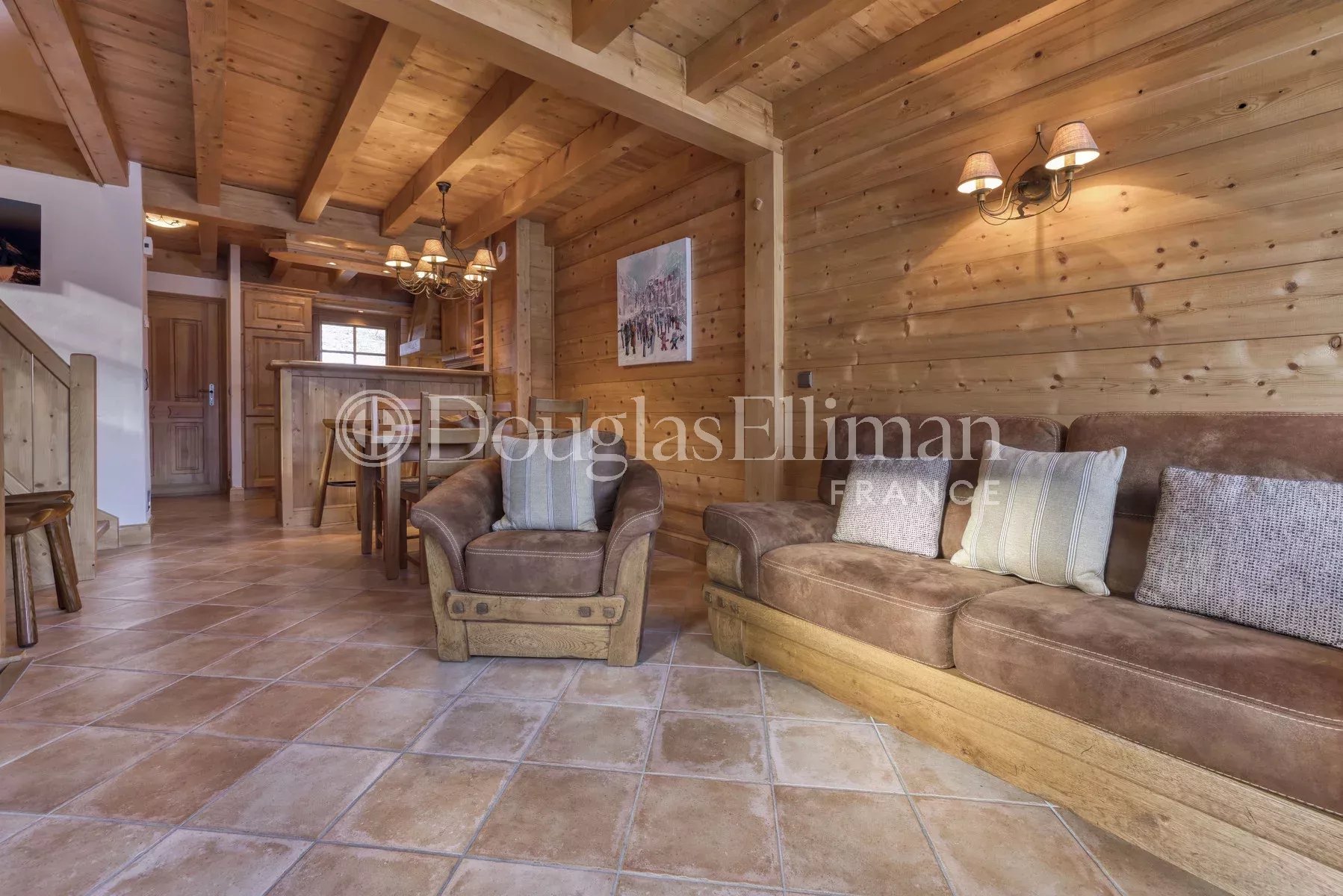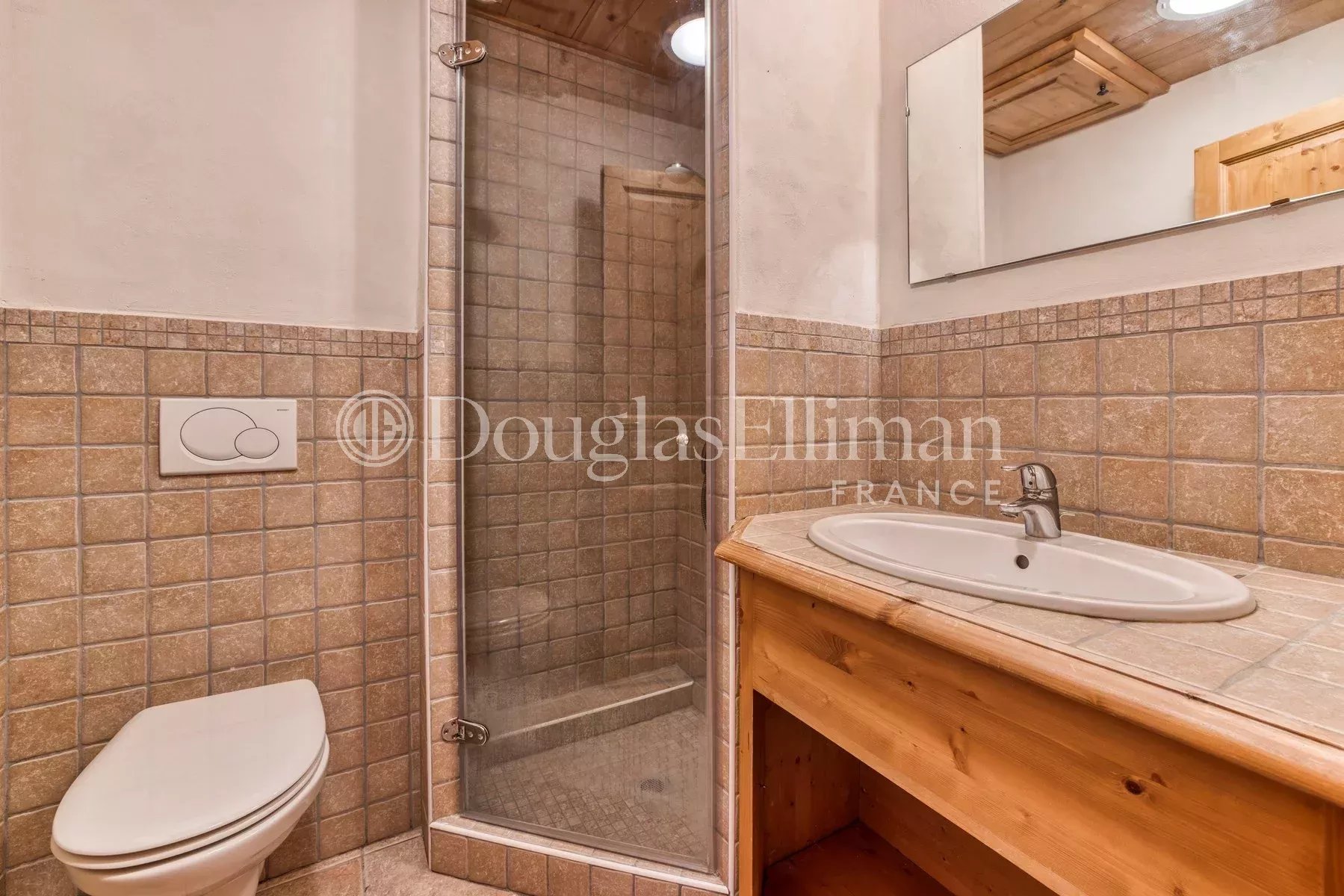 L’appartement est réparti sur trois niveaux. Le rez-de-chaussée comprend un garage privé, une buanderie et un local à skis. Le premier étage comprend une cuisine ouverte, une salle à manger et un salon donnant sur une terrasse avec une vue imprenable sur le massif du Mont-Blanc. Le deuxième étage offre deux chambres avec salle de bains privative, chacune dotée d’un balcon bien proportionné.