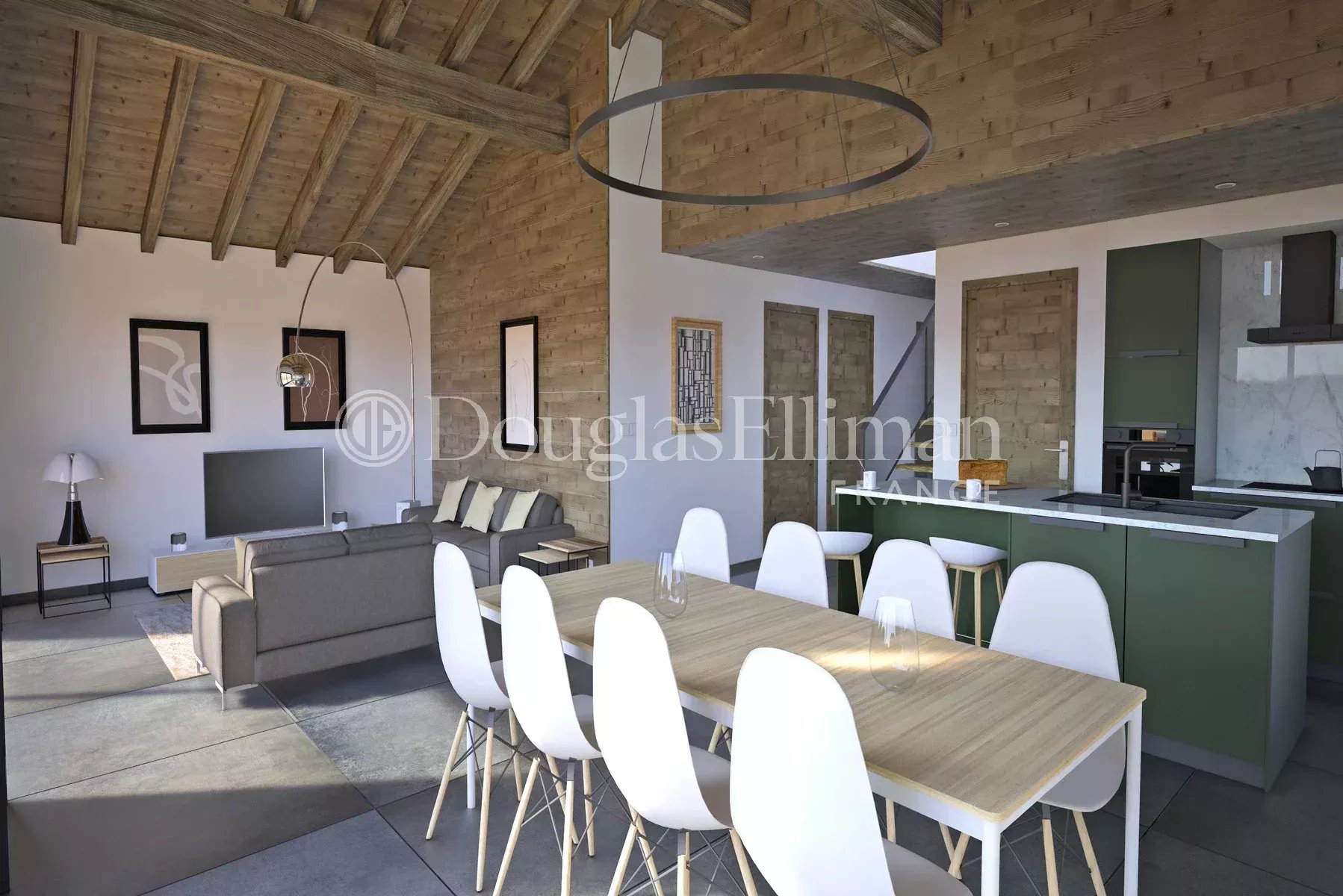 Le chalet a été conçu pour épouser la pente naturelle du terrain, offrant de beaux volumes intérieurs et une belle luminosité tout au long de la journée. La pièce de vie principale se compose d’un séjour et d’une salle à manger en double hauteur, avec de larges baies vitrées coulissantes ouvrant sur une terrasse panoramique. Les finitions intérieures peuvent être personnalisées, avec la possibilité d’ajouter un jacuzzi sur la terrasse.