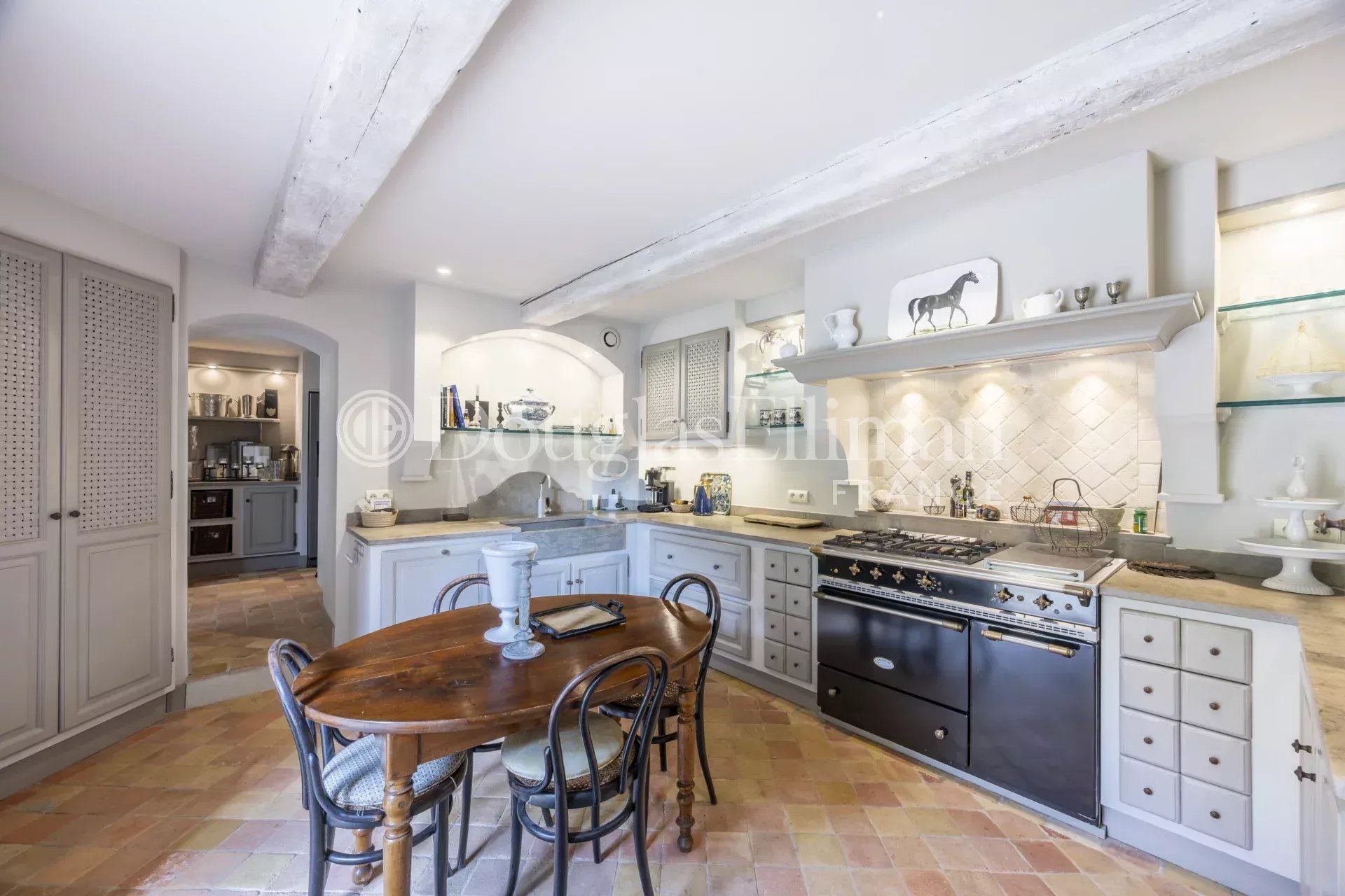 Le Mas comprend un hall d’entrée menant à une cuisine française chaleureuse et fonctionnelle, équipée d’un office / cellier, et donnant directement accès à une terrasse ombragée, parfaite pour les repas en plein air, recouverte de glycines en fleurs. La cuisine est dotée d’un plan de travail en pierre et d’équipements de qualité.