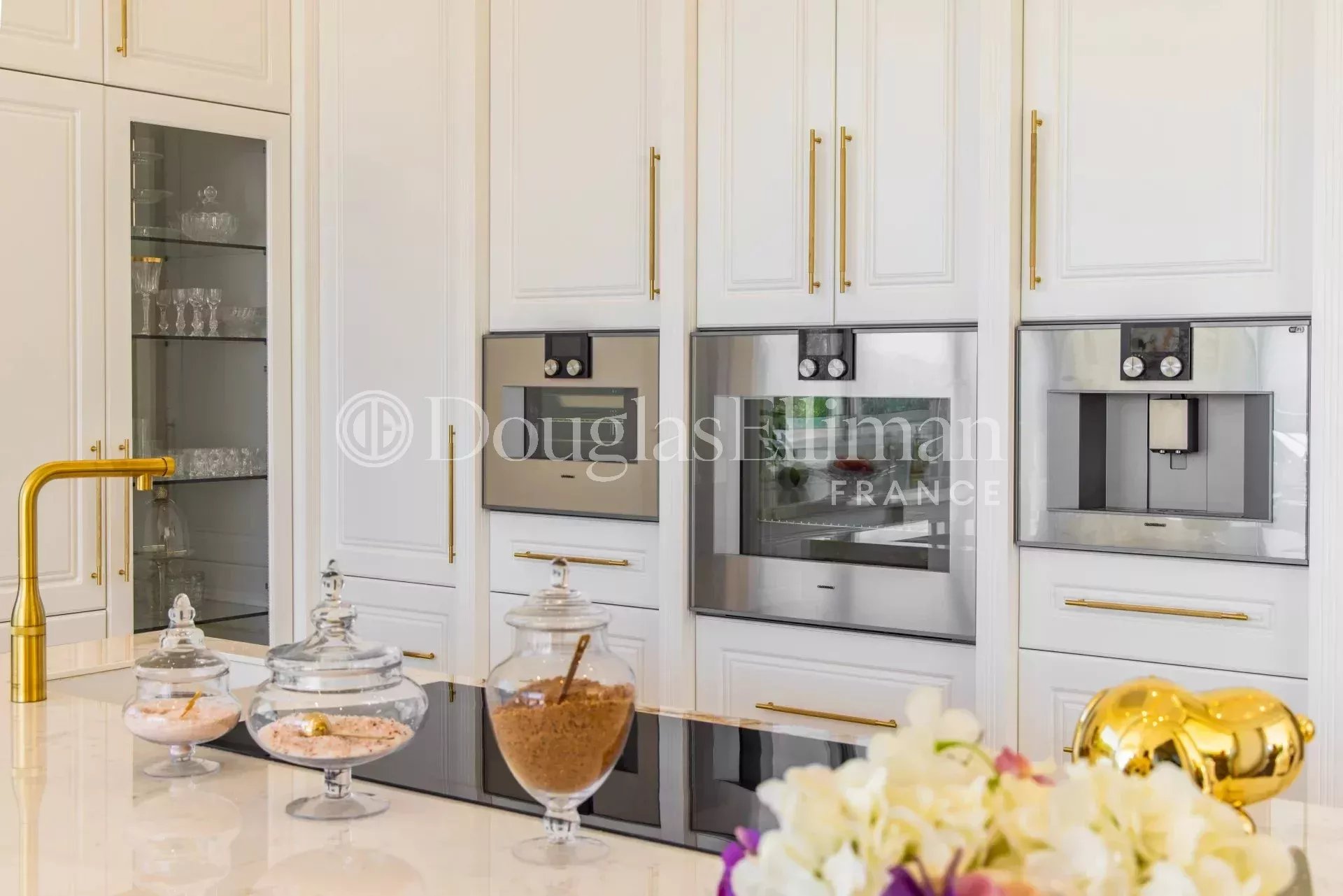 La villa impressionne immédiatement par son hall d’entrée à double hauteur, doté d’un vaste mur de marbre blanc. Le vaste espace de vie et de repas est incroyablement lumineux et aéré, grâce à ses nombreuses baies vitrées qui donnant sur la terrasse extérieure couverte, le jardin et la piscine. La cuisine haut de gamme est conçue sur mesure avec des finitions de tons et des plans de travail en marbre.