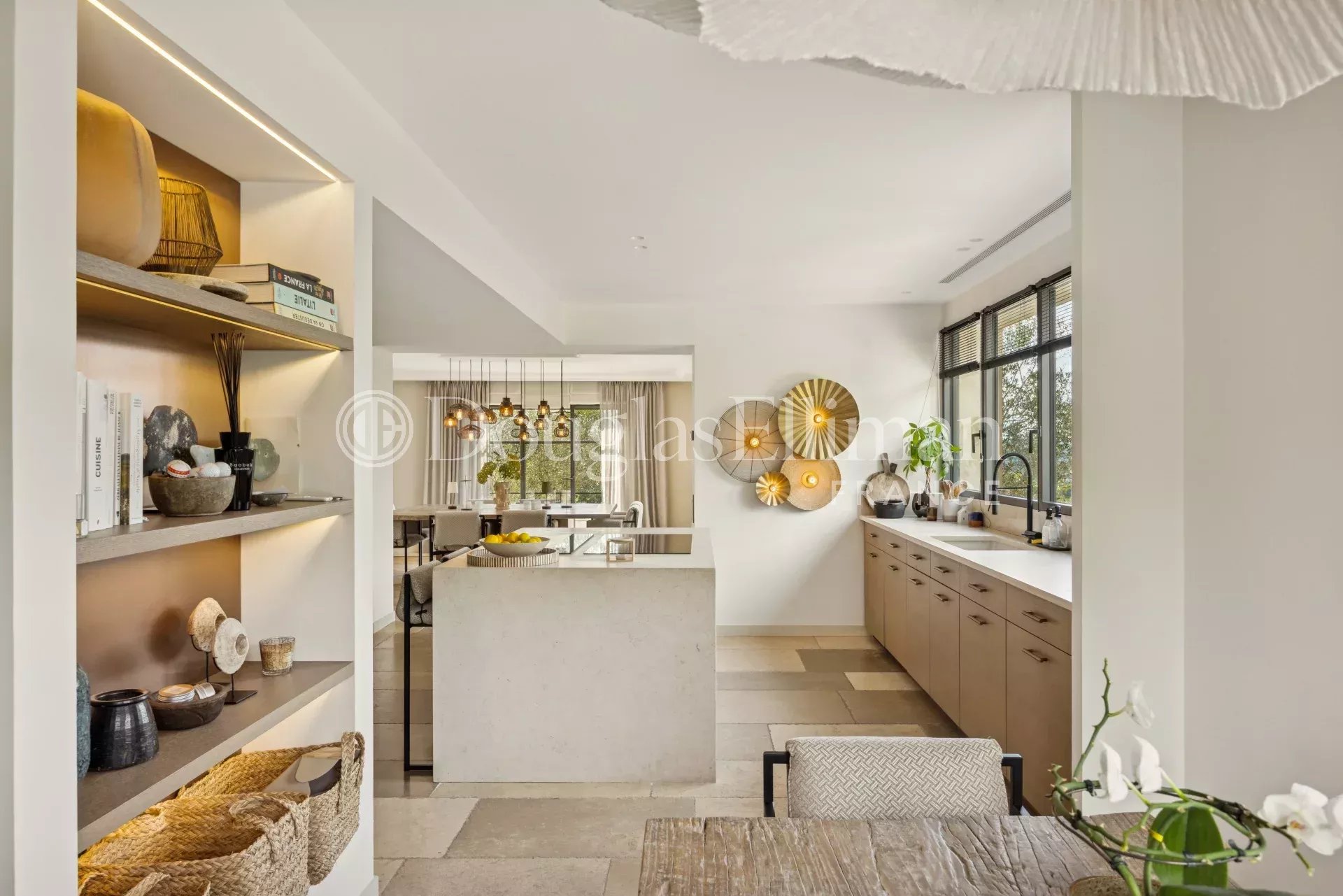 Au cœur de la villa, un vaste séjour et salle à manger s’ouvrent sur une cuisine ouverte dotée d’un office parfaitement aménagé. Une cheminée à bois apporte chaleur et caractère, tandis que les terrasses et jardins paysagers prolongent la maison à l’extérieur. Parmi les jardins, un bosquet d’oliviers centenaires complète la piscine scintillante et les multiples espaces dédiés à la vie en plein air.