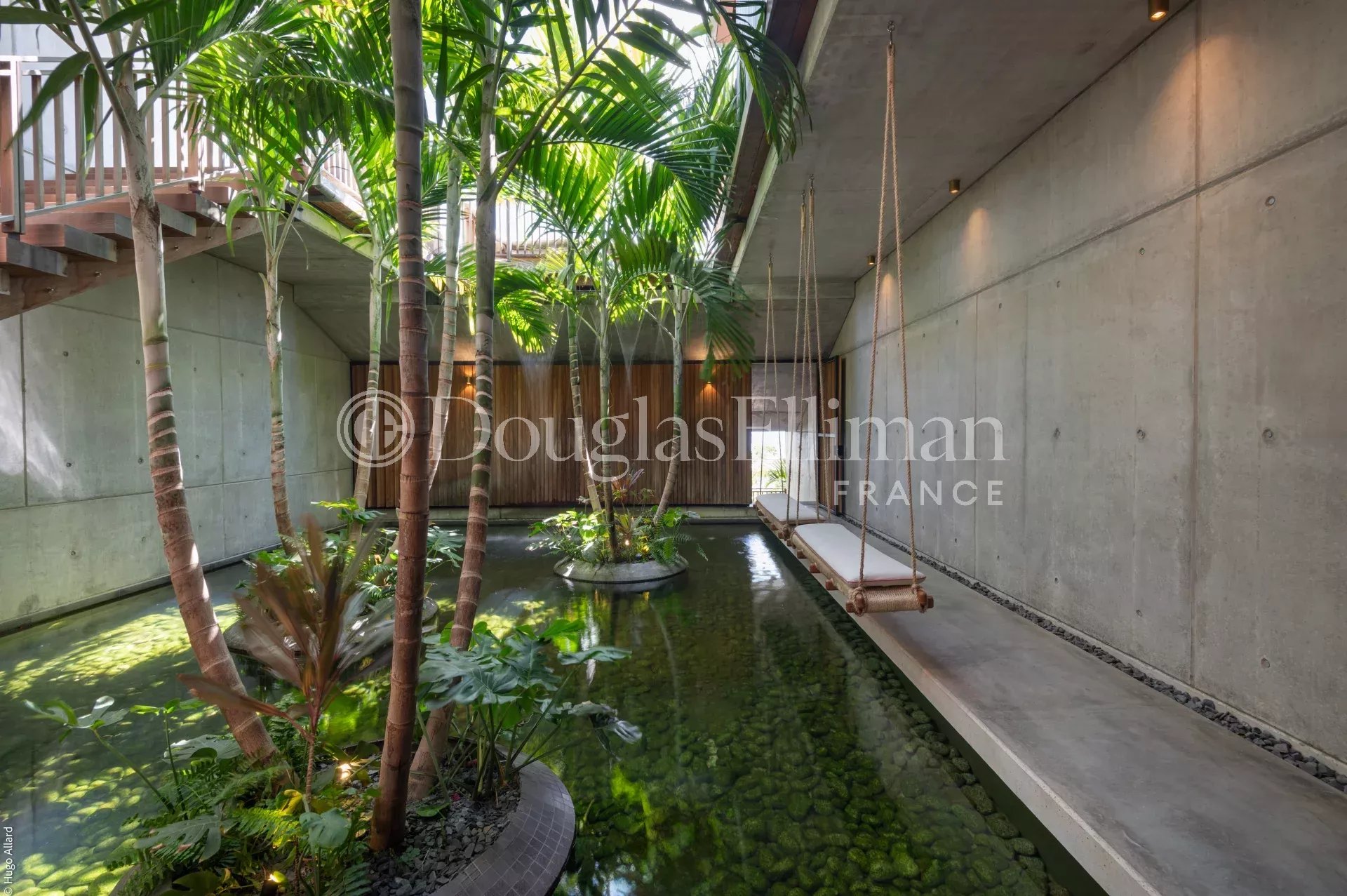 Entre les deux villas, un élégant bassin japonais animé par une cascade crée une transition poétique et apaisante entre les espaces, renforçant l’identité unique du lieu.
