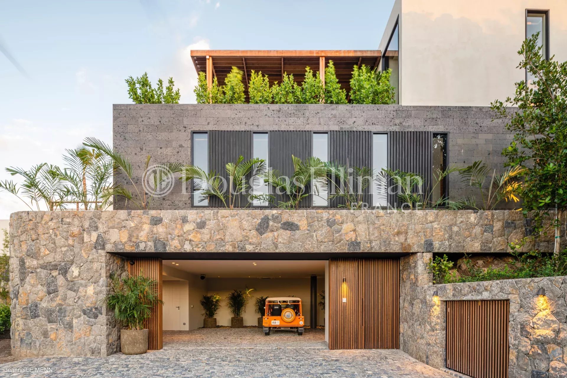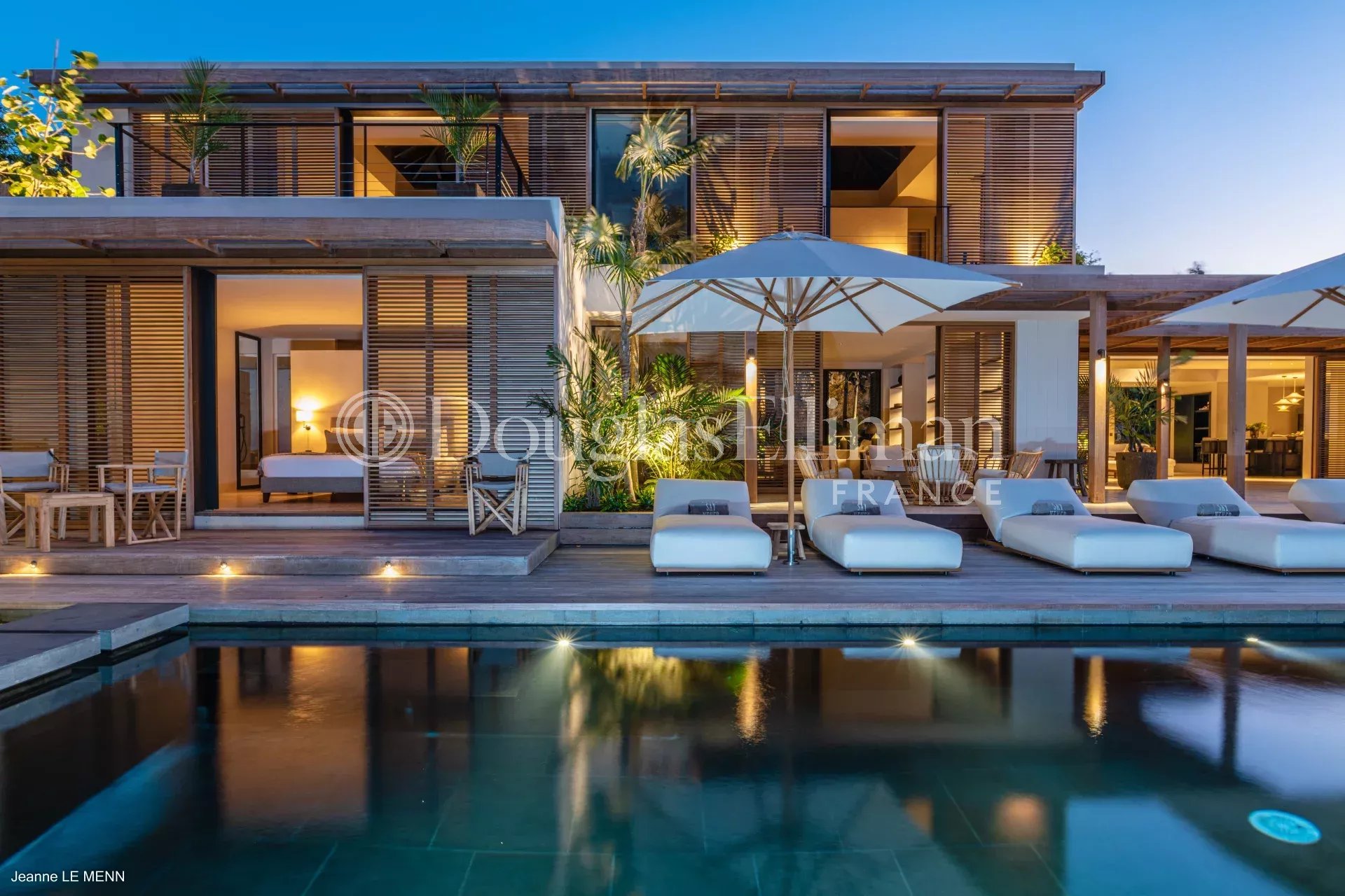 Implantée sur un terrain de 2 000 m², la villa propose des prestations haut de gamme incluant une piscine à débordement chauffée, une salle de sport et un garage intérieur.